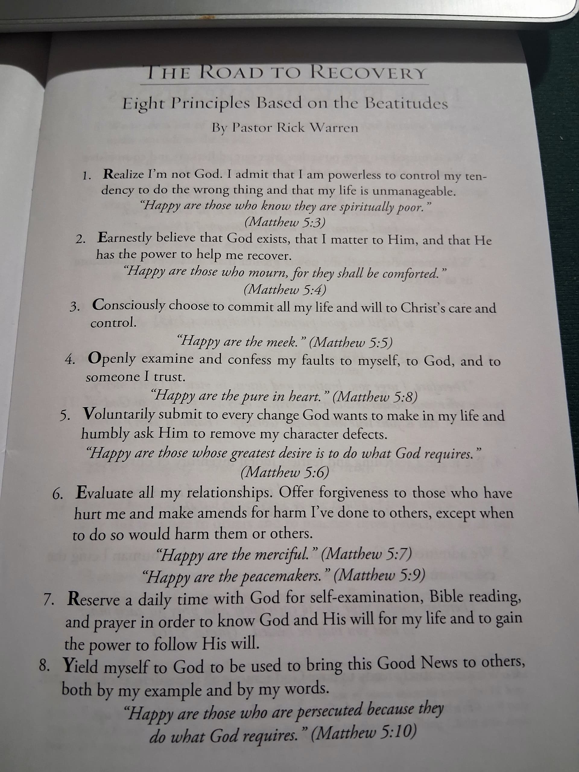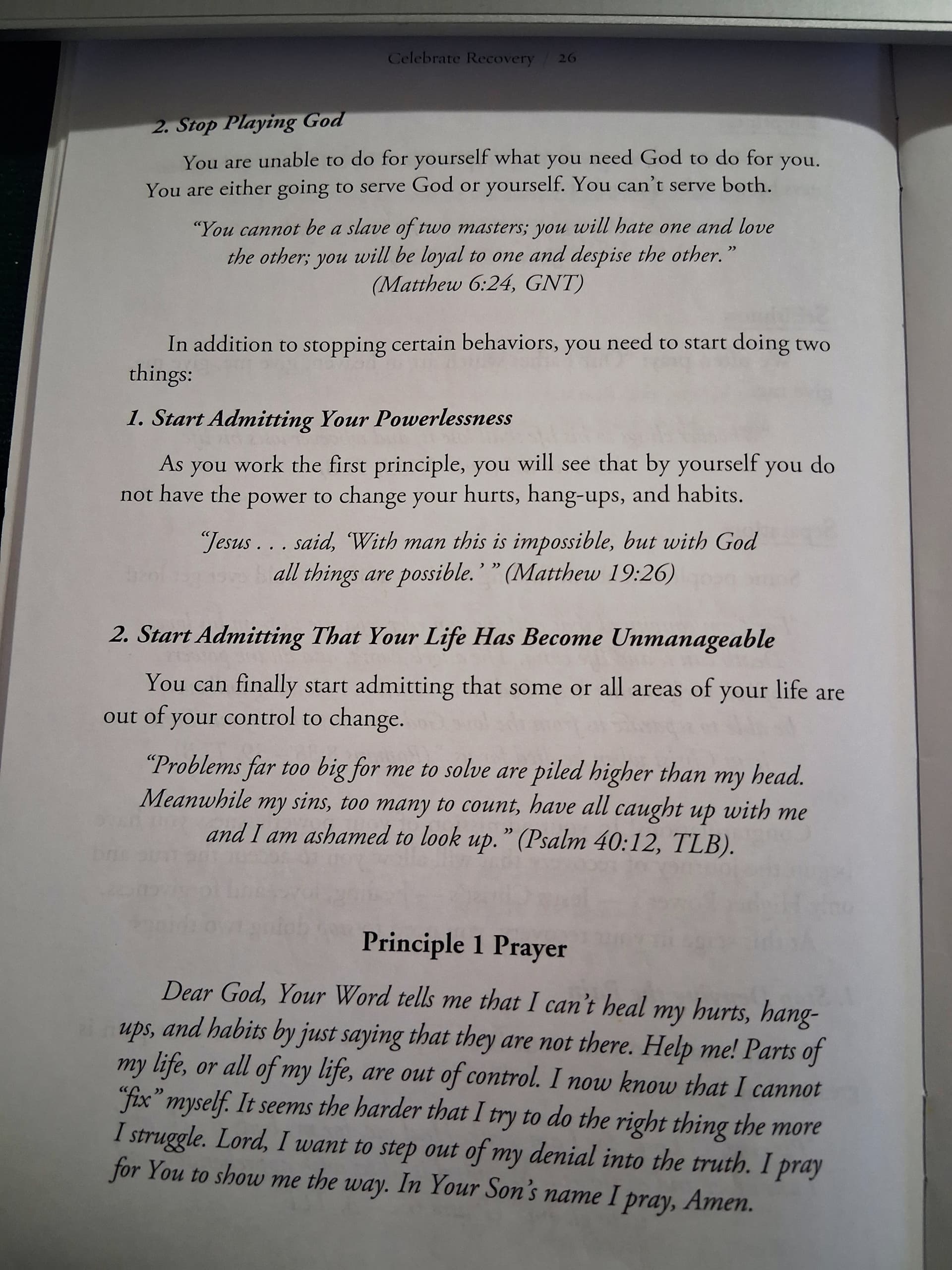 Principle 1: Realize I am not God. I admit that I am powerless to control my tendency to do the wrong thing and that my life is unmanageable.