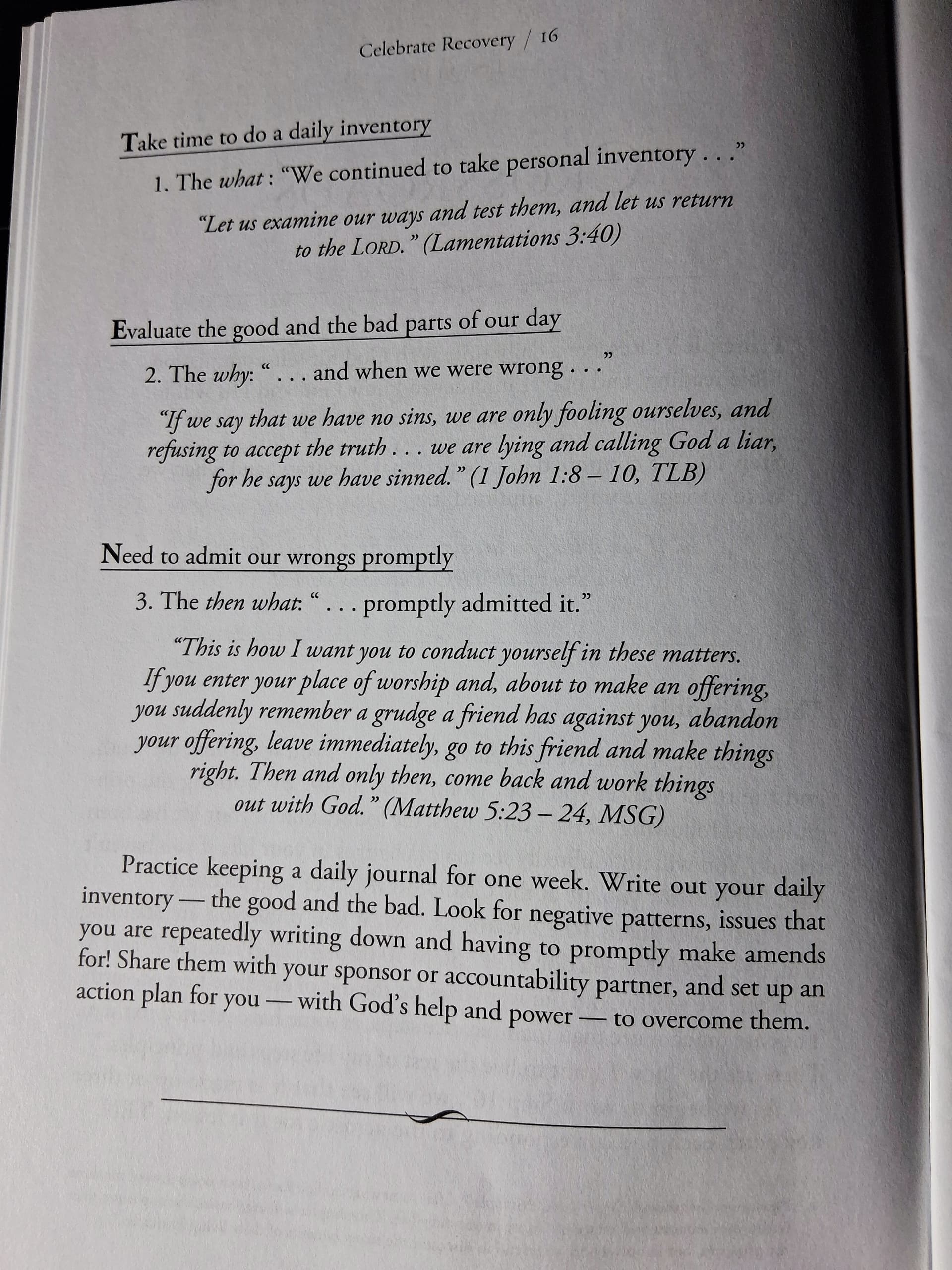 - Keep a daily journal over the next 7 days. Record the good along with the bad. Write down victories and areas of needed growth. Look for patterns. Share them with your sponsor or accountability partner at the end of the week.