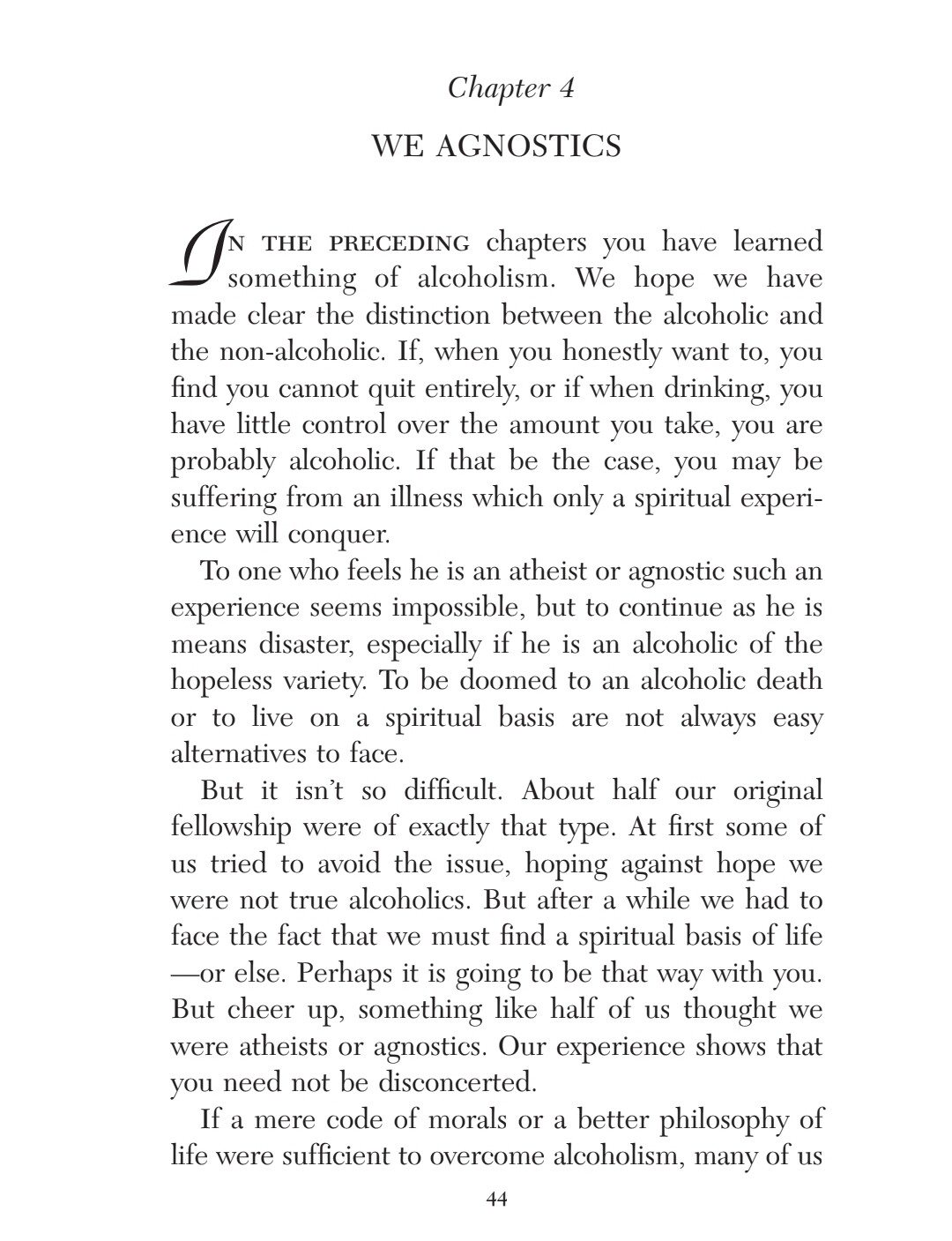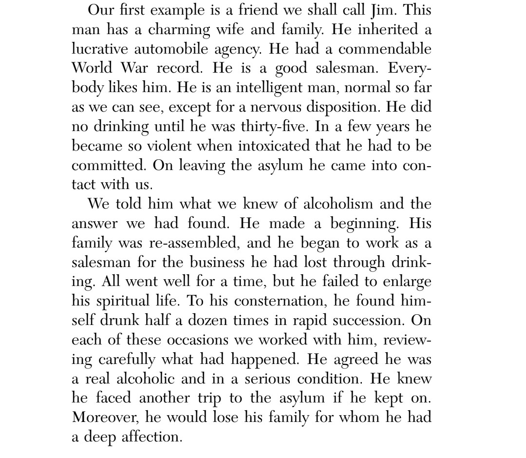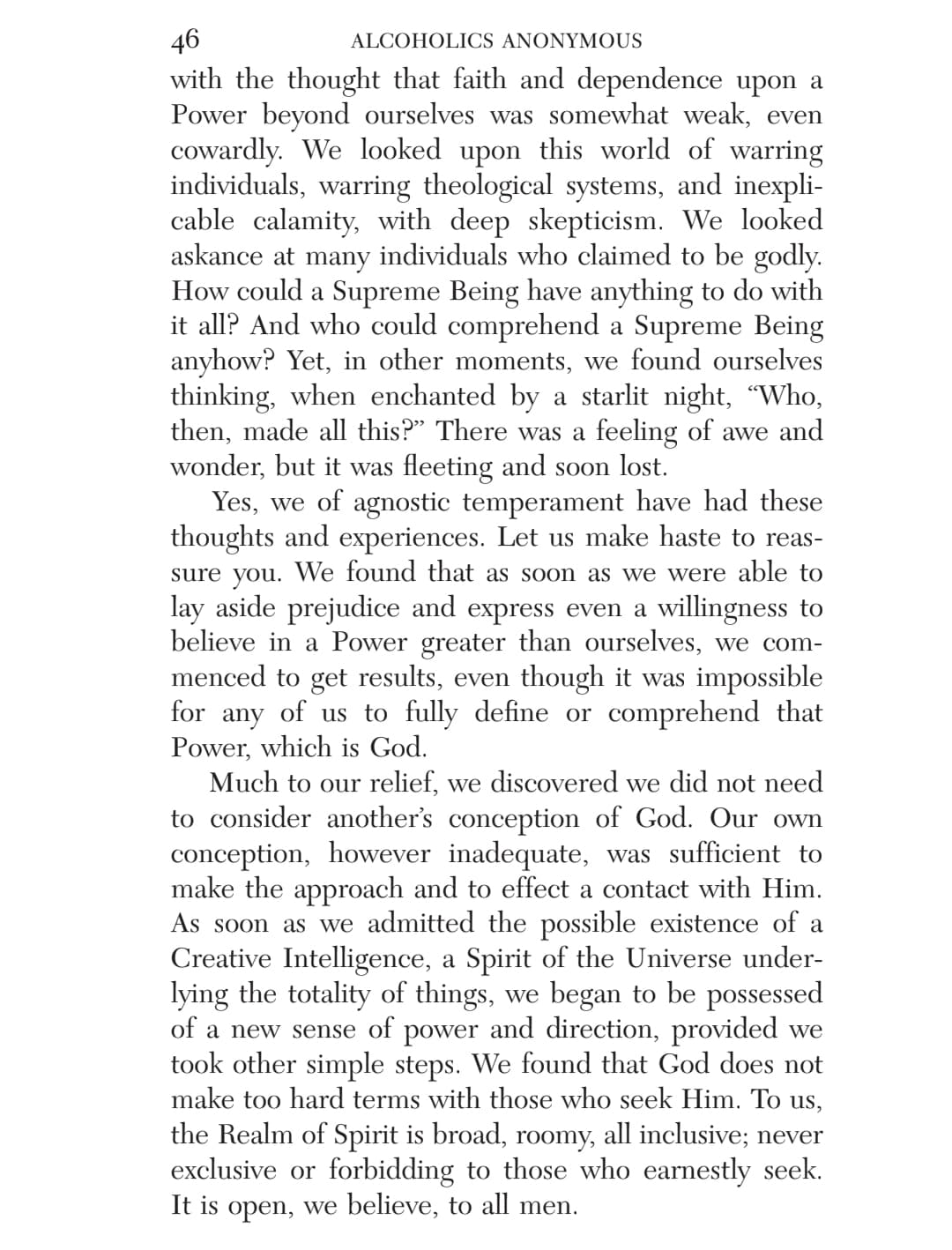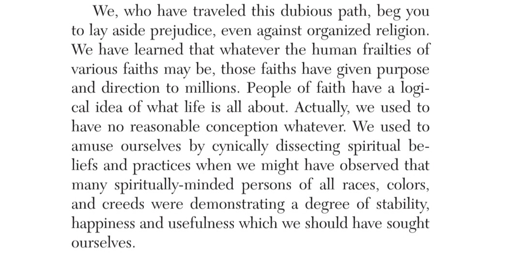 This chapter reminds me of the low I had to hit in order to be willing to work on the steps and follow the guiding of a sponsor. I was utterly without power on my own, and my lifelong search in and out of religion for a higher power left me convinced that though there might have been a First Cause around the time of the Big Bang, there was no divinity, no agency above humanity and certainly not one that cared about any particular individual.