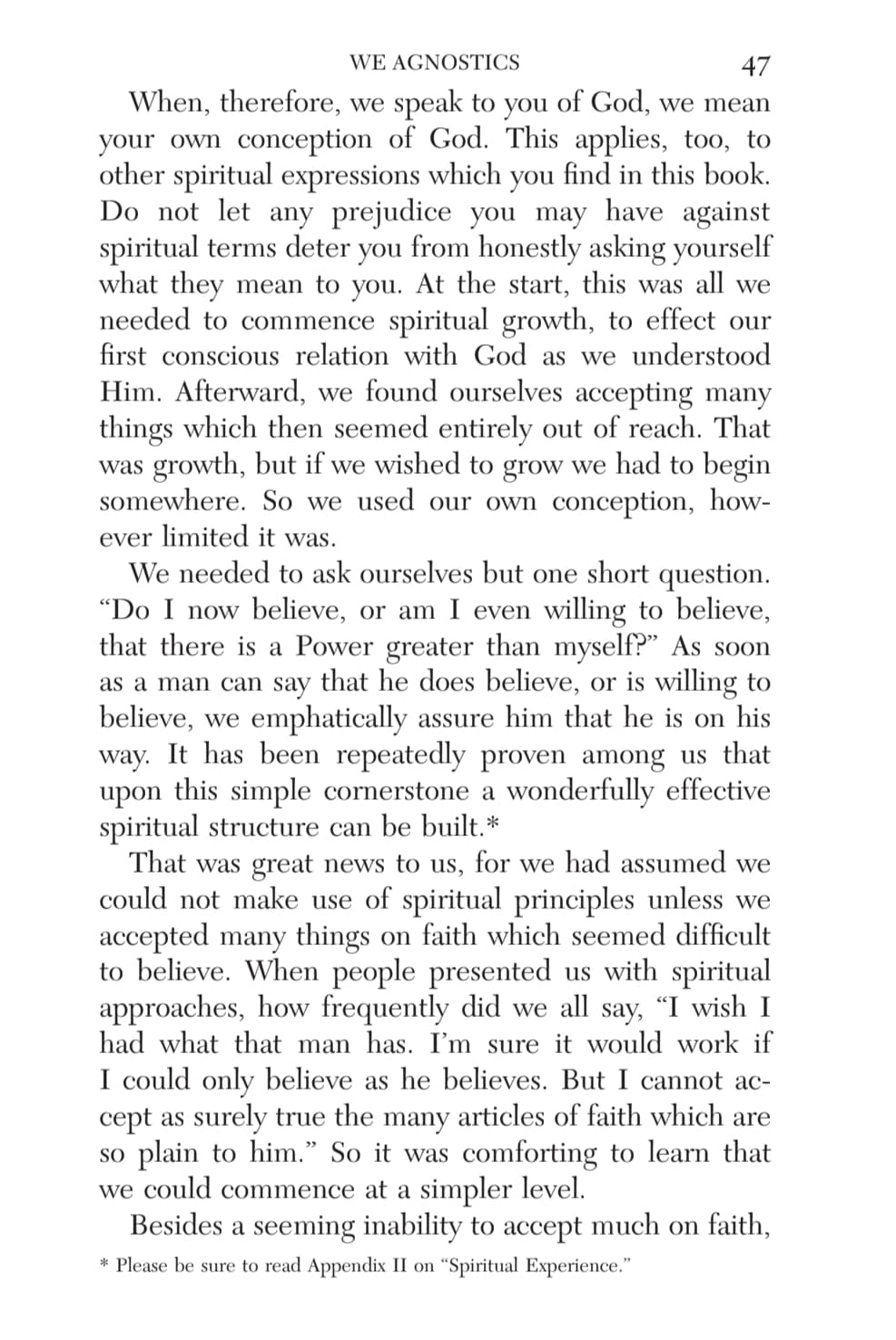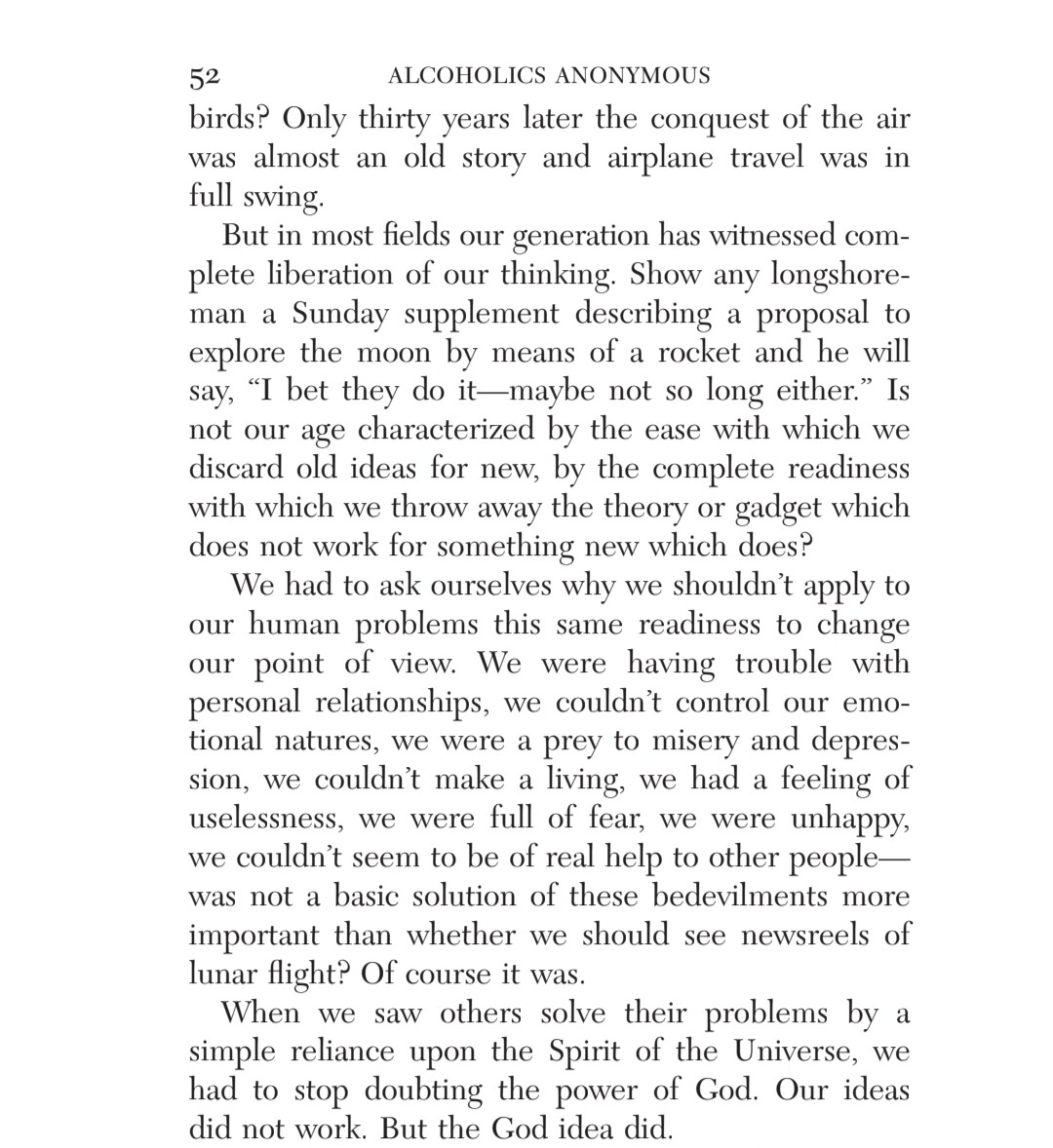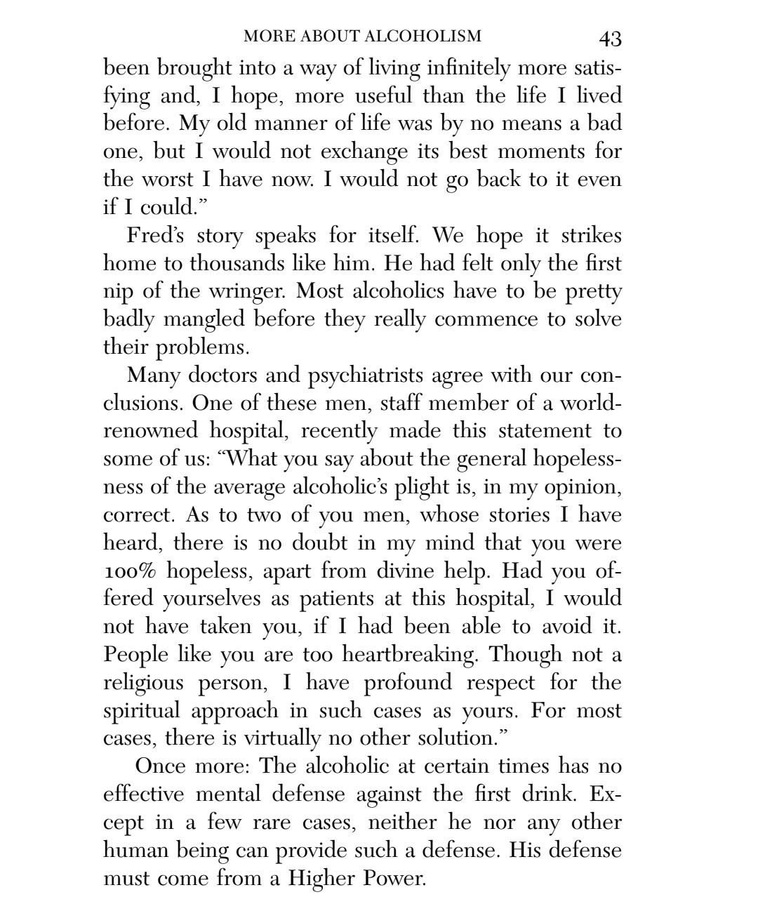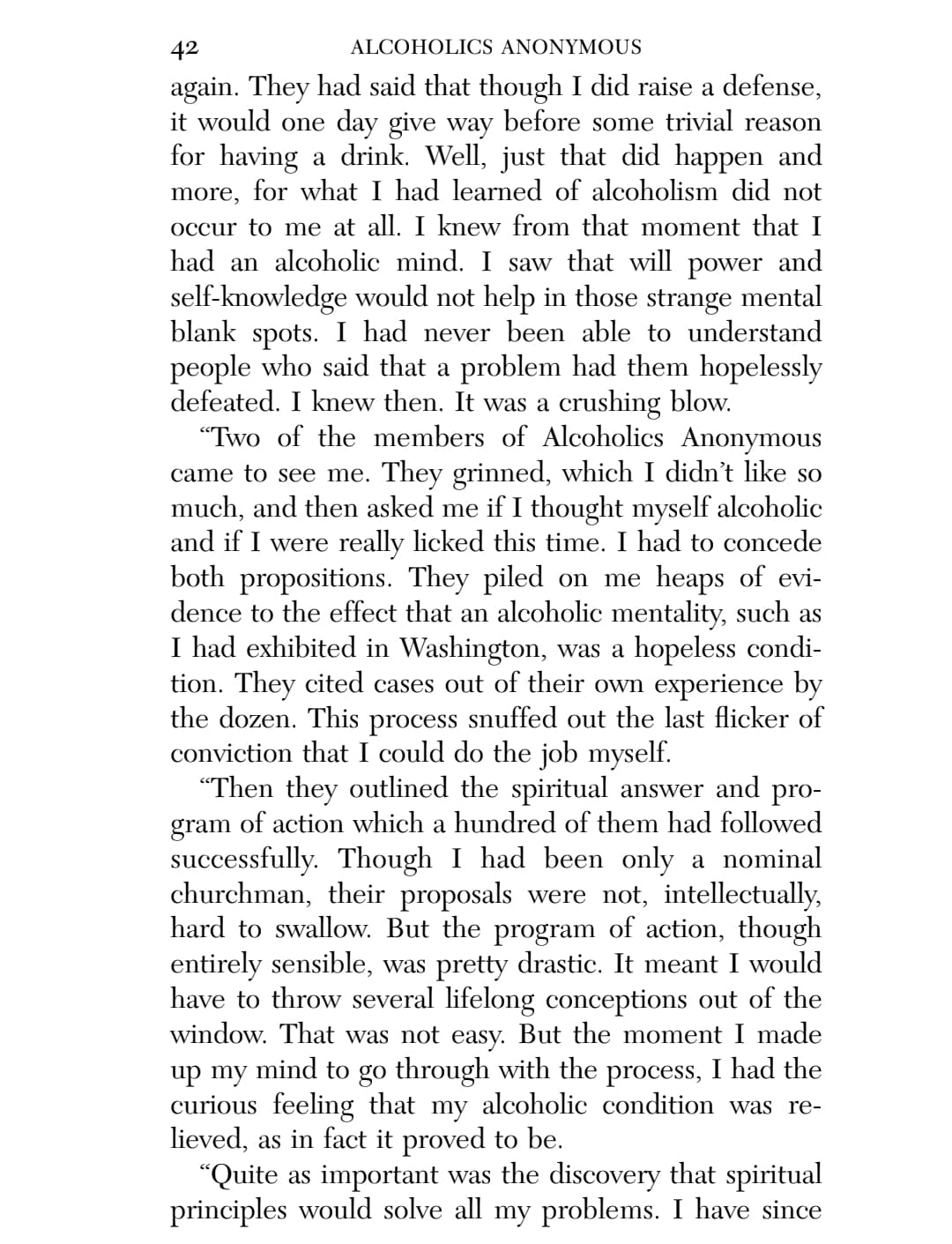 This chapter reminds me of the low I had to hit in order to be willing to work on the steps and follow the guiding of a sponsor. I was utterly without power on my own, and my lifelong search in and out of religion for a higher power left me convinced that though there might have been a First Cause around the time of the Big Bang, there was no divinity, no agency above humanity and certainly not one that cared about any particular individual.