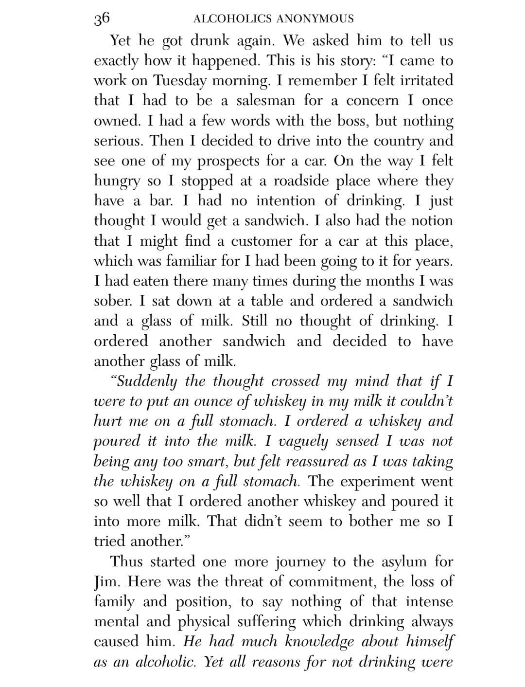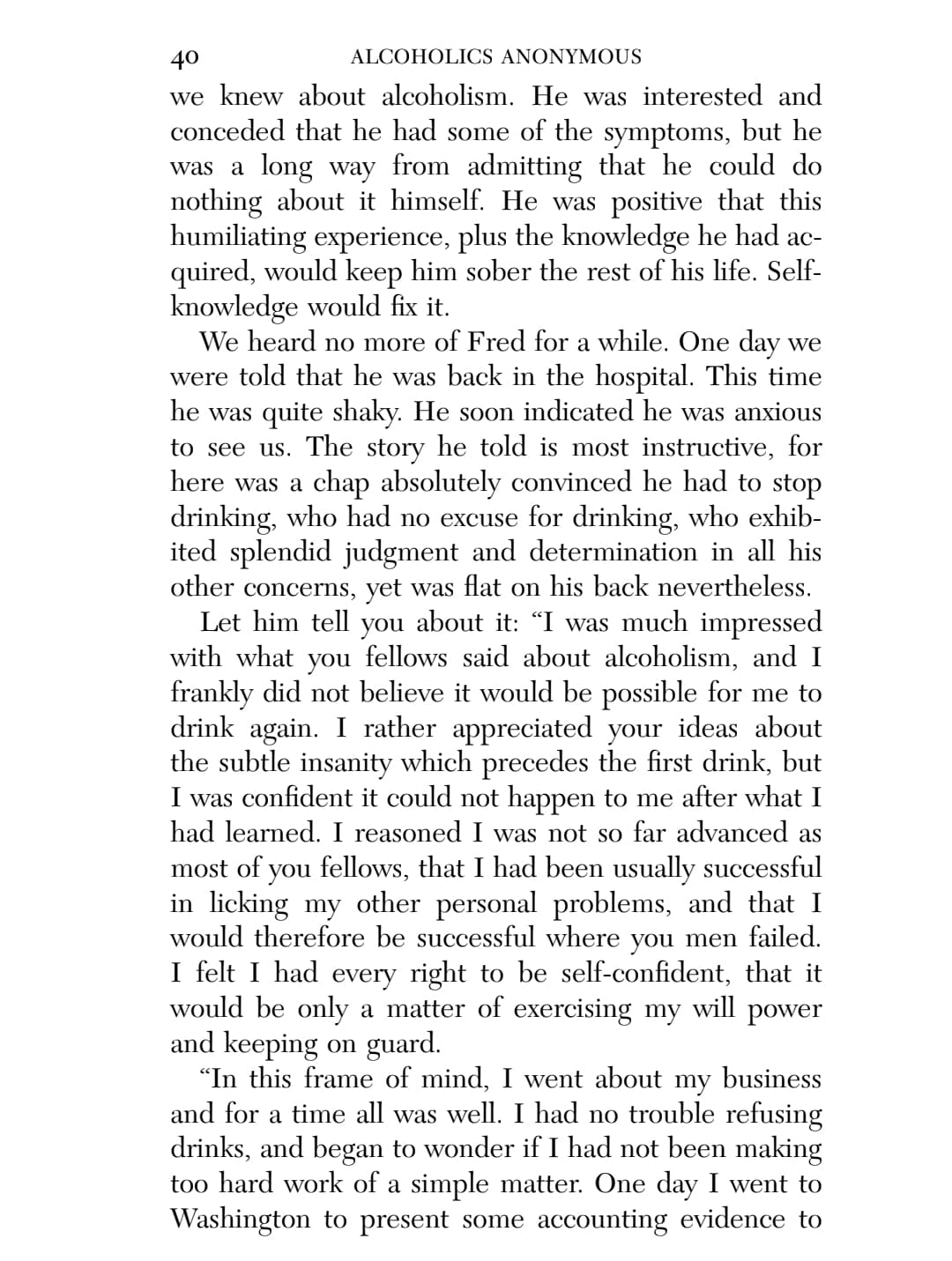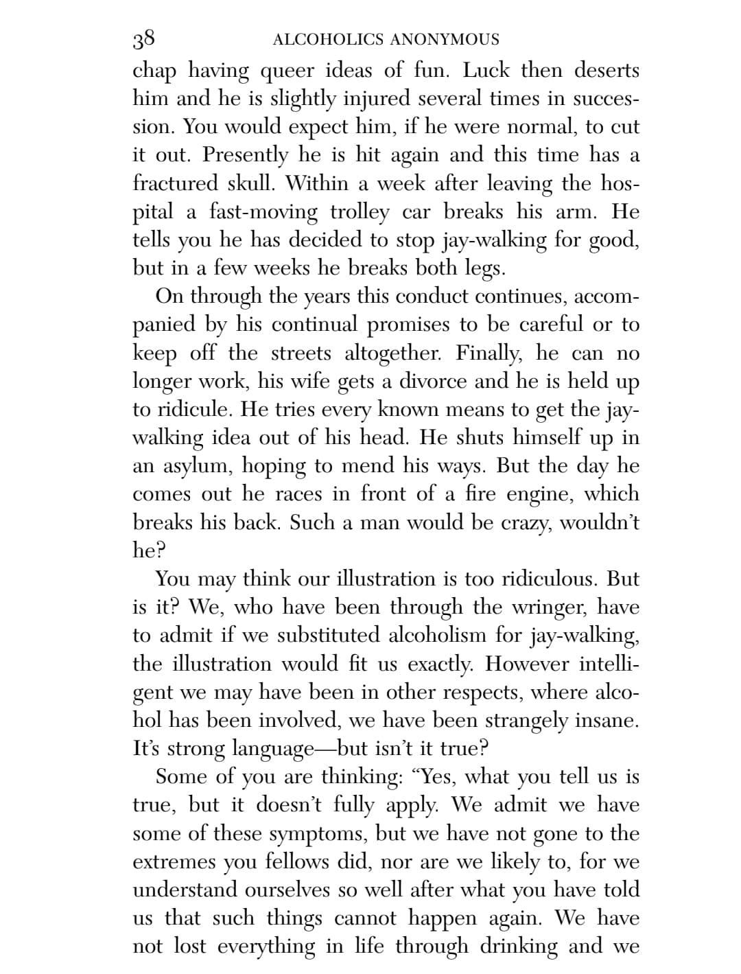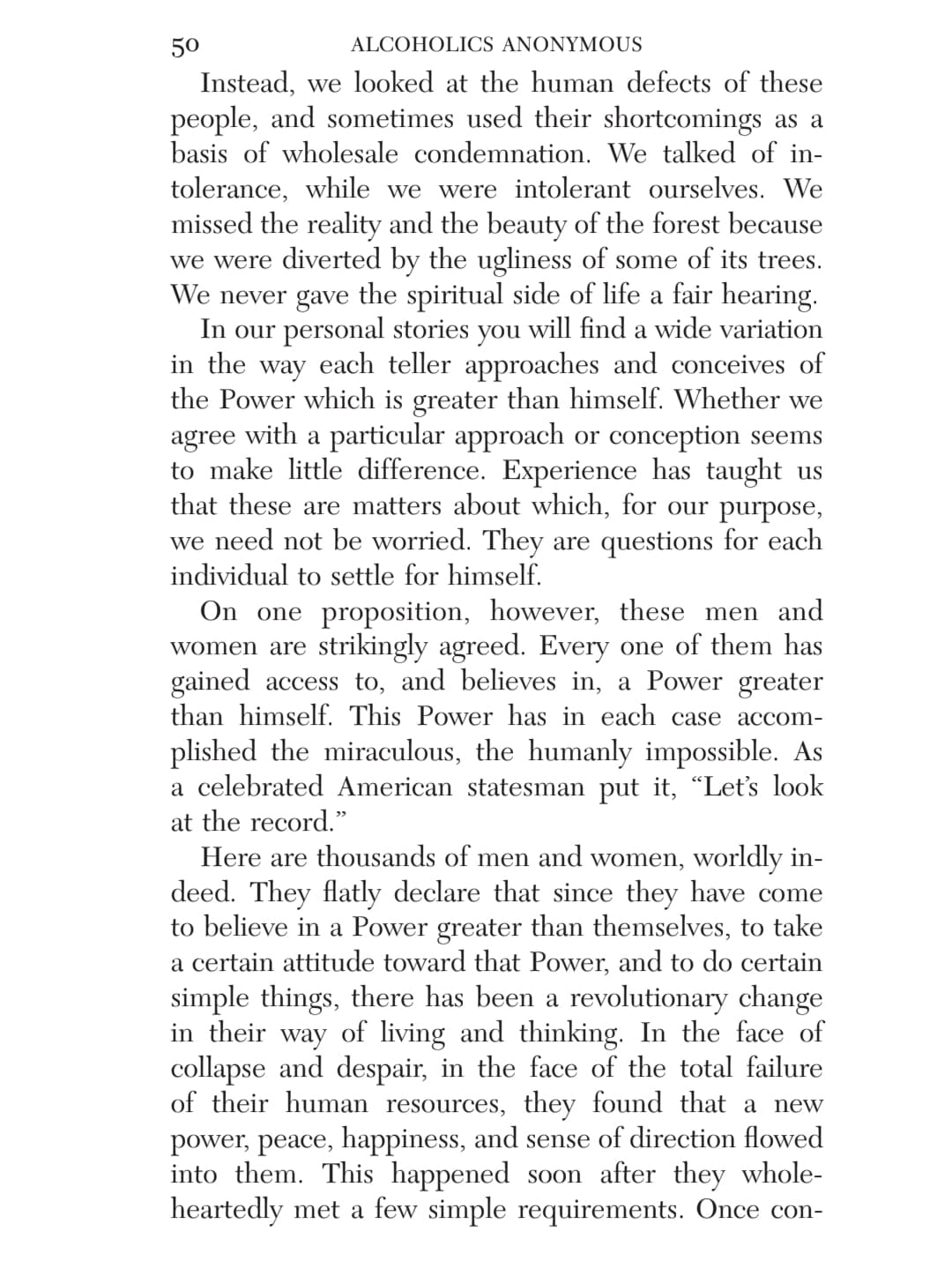 This chapter reminds me of the low I had to hit in order to be willing to work on the steps and follow the guiding of a sponsor. I was utterly without power on my own, and my lifelong search in and out of religion for a higher power left me convinced that though there might have been a First Cause around the time of the Big Bang, there was no divinity, no agency above humanity and certainly not one that cared about any particular individual.
