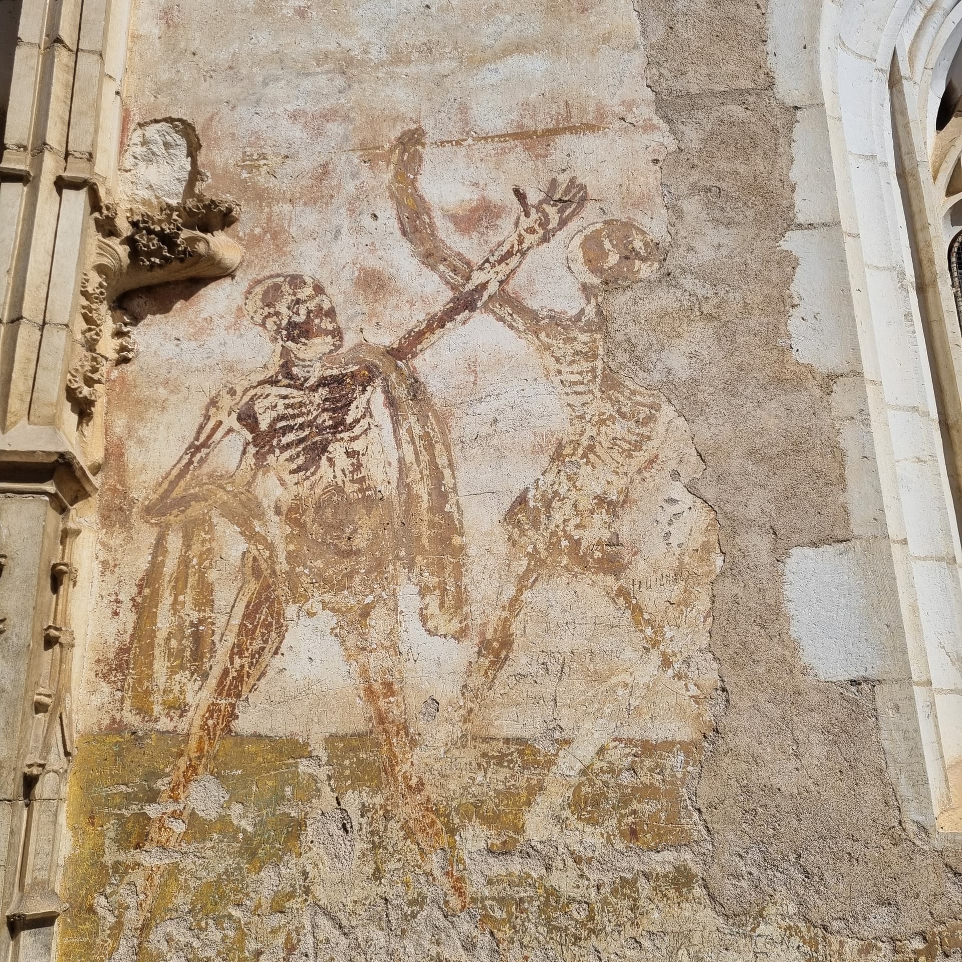 Picture of 2 dancing ore fighting (?) Skeletons on the wall of a church I saw in France last holiday. It put a smile on my face back then and now