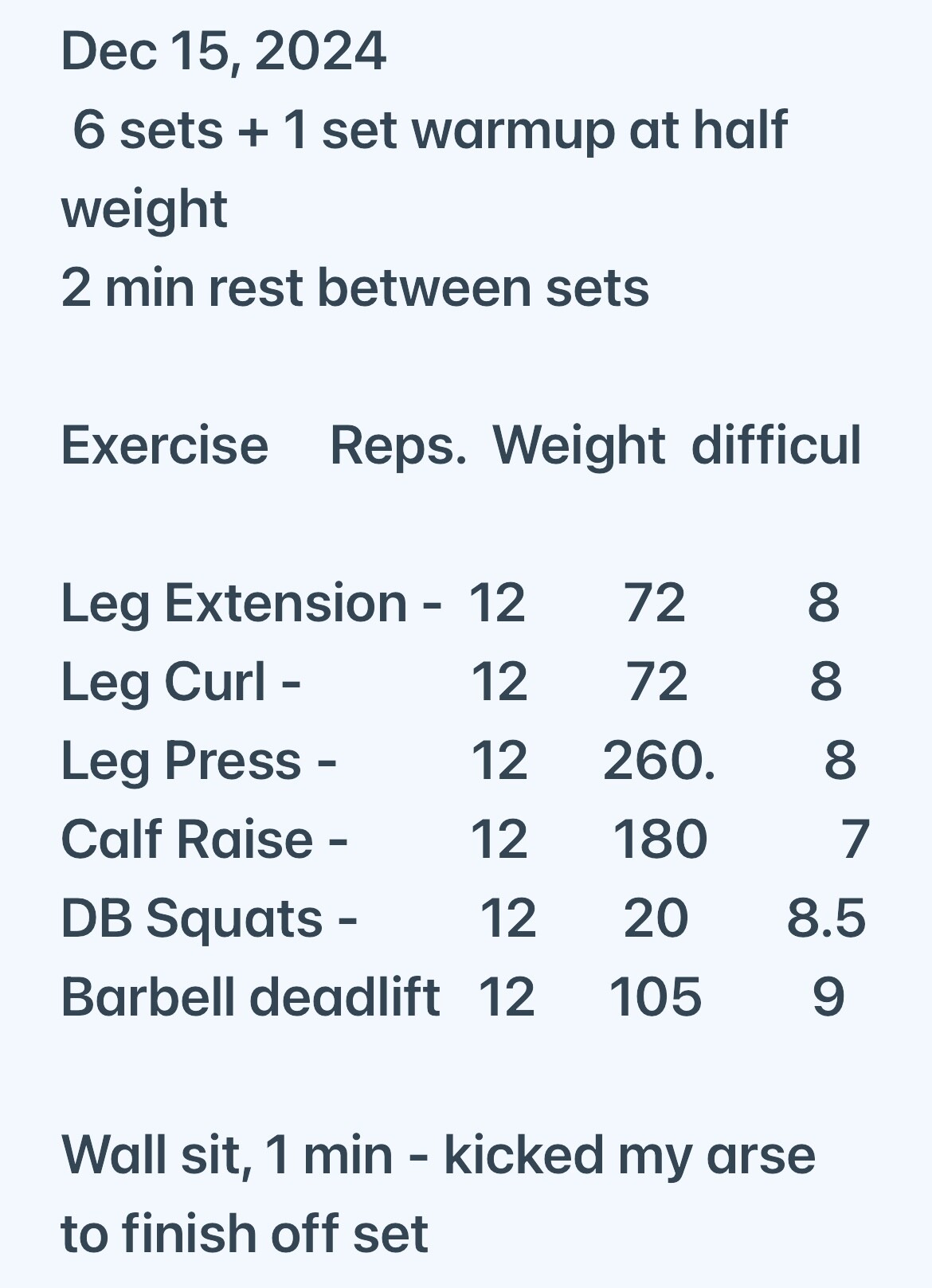 Don’t track set of warmup nor my cooldown so that was just workout and wall sit, which kicked my damn ass.