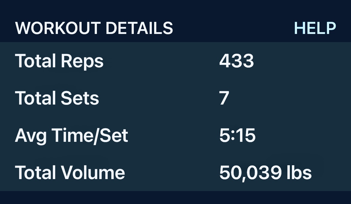 Workout tracked and said just over 50,000lbs of volume… not sure if that’s a lot but it sure sounds it and it was an intense workout.