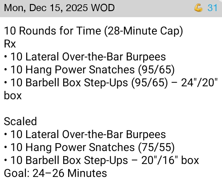 I used the training bar with 10lbs. plates on it for a total of 35lbs. Itās just too early in the week for all that snatching. ![]()
