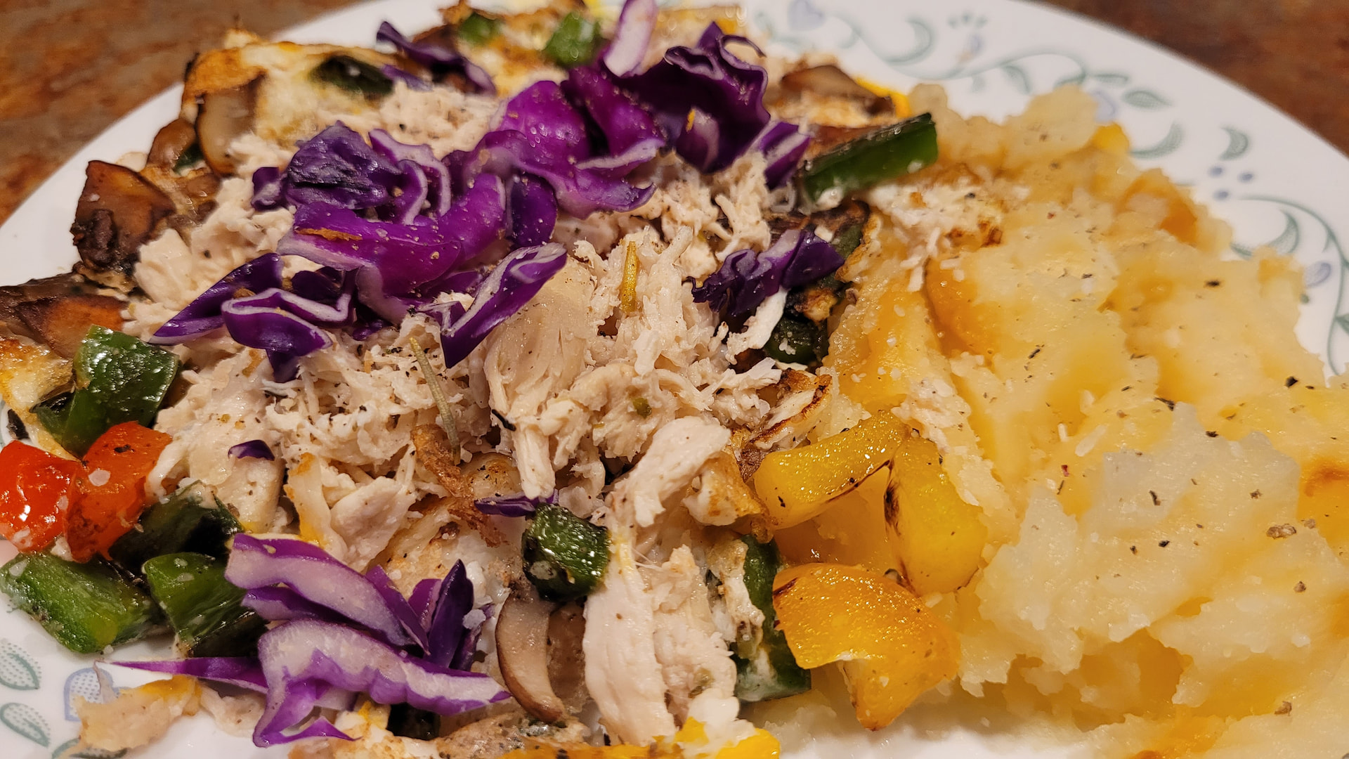 Breakfast: 2 eggs, 40g chicken breast, 110g yellow sweet potato, 50g peppers, 5g red cabbage, 22g mushroom, 10g butter.
