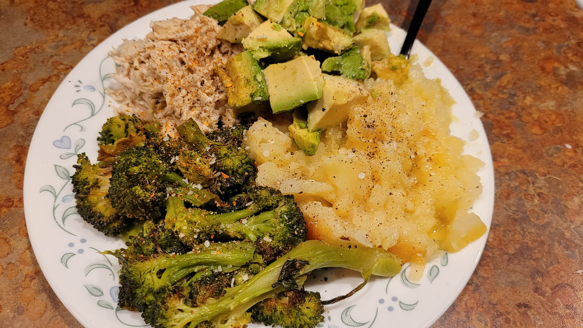 160g sweet potato, 110g chicken breast, 80g broccoli, 85g avocado, 15g butter.