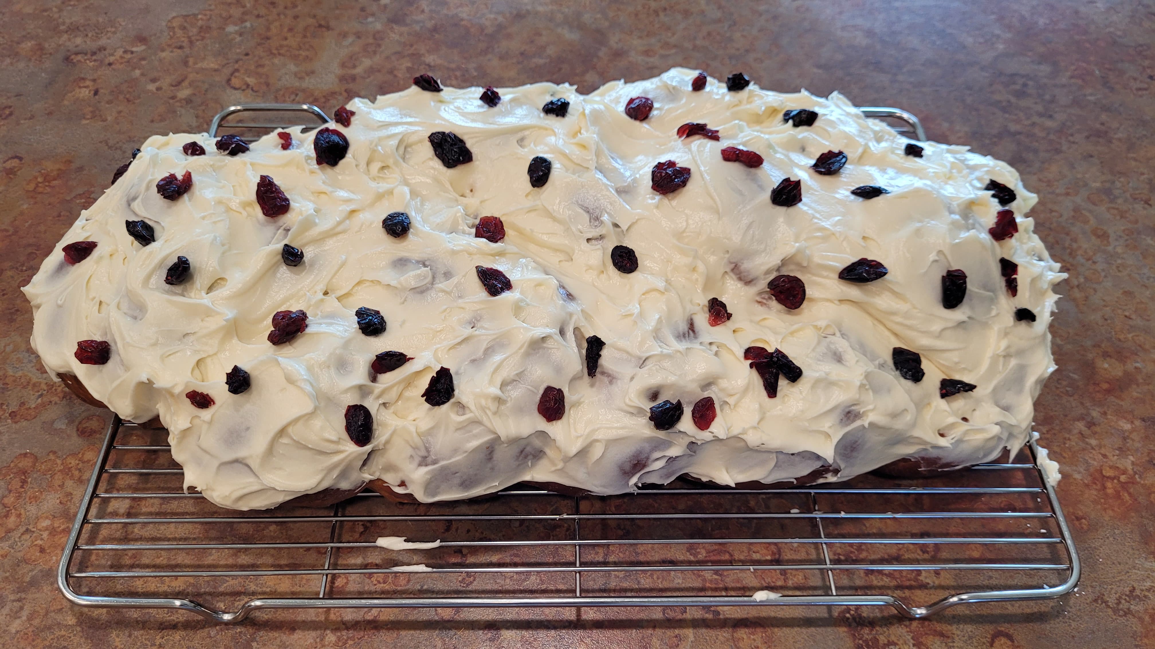 I’d planned on making hot cross buns today, but instead I made a modified challah. There are blueberry and cherry flavored dried cranberry pieces and a light cream cheese frosting.