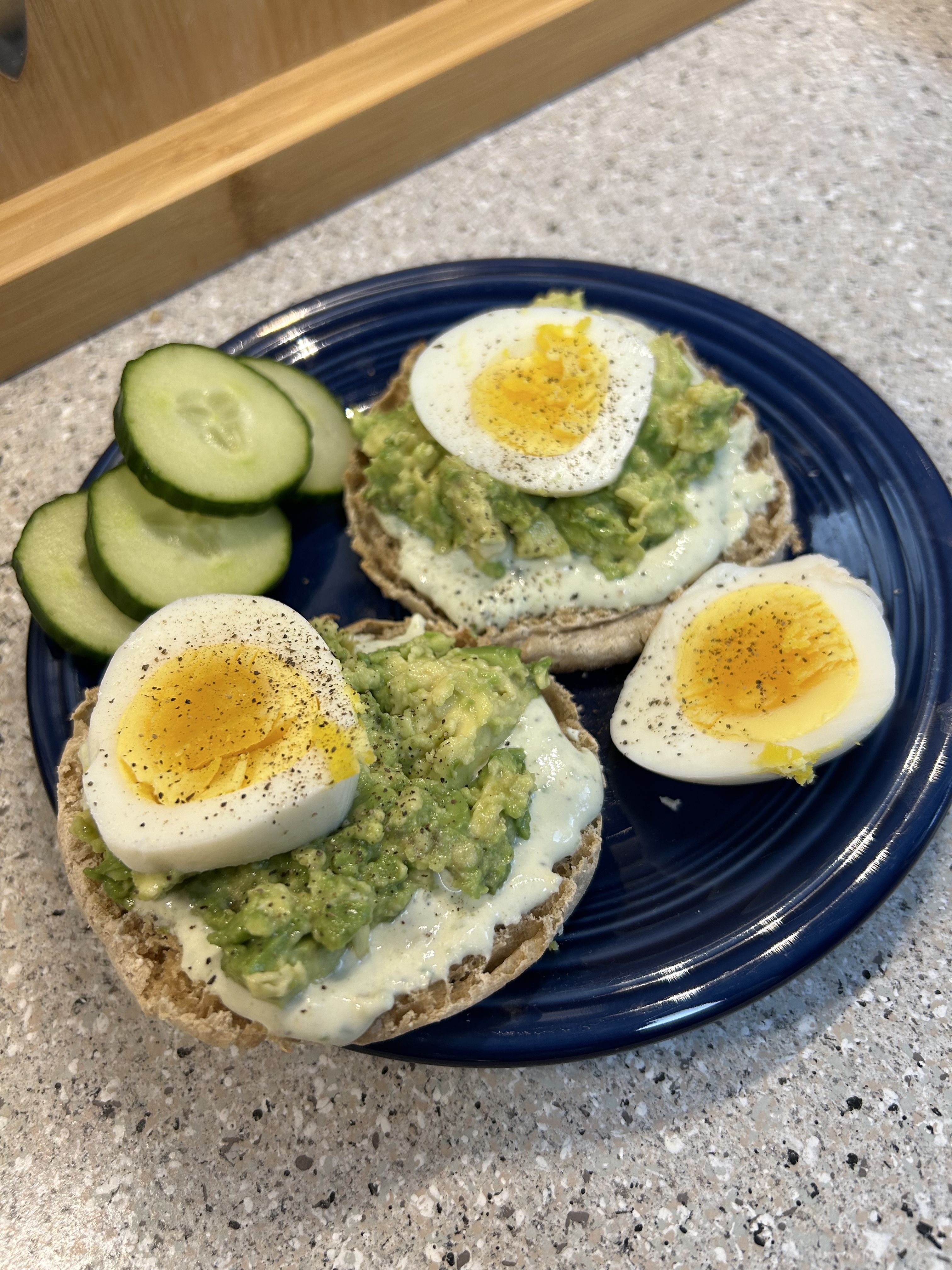 Wheat muffin with my whipped cottage cheese green goddess dip/spread (tastes even better today!), avocado and hard cooked egg. Simple and tasty.