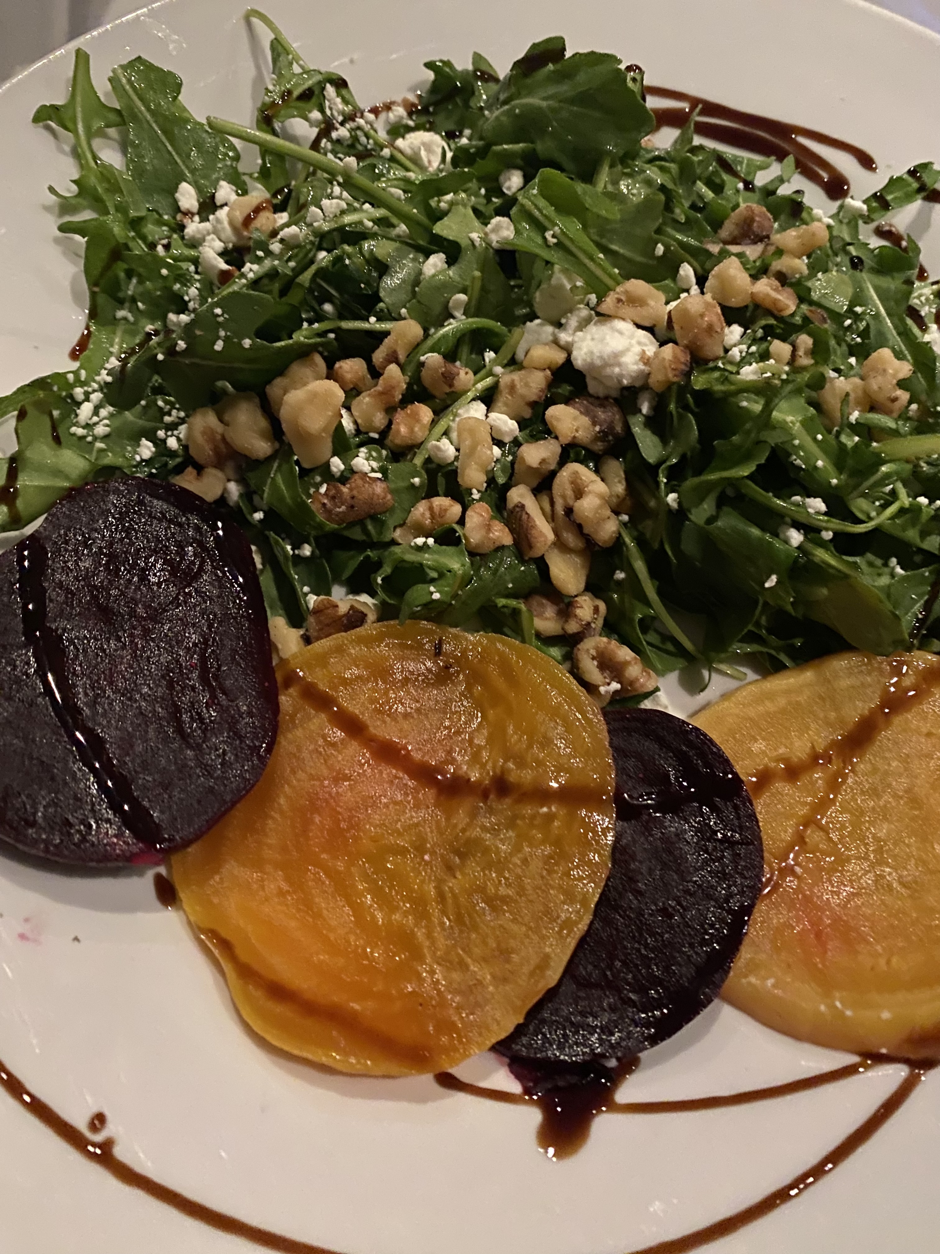 red & chioggia beets + goat cheese fritter + toasted walnuts + arugula + mustard vinaigrette