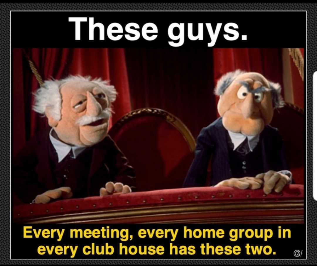 That or complaining that the chair is reading from their annotated digital copy of the Big Book rather than the meeting provided copy grumbling underneath their breath loud enough for everyone to hear that Bill W said we needed paper to get sober, it’s worked for 80 years…