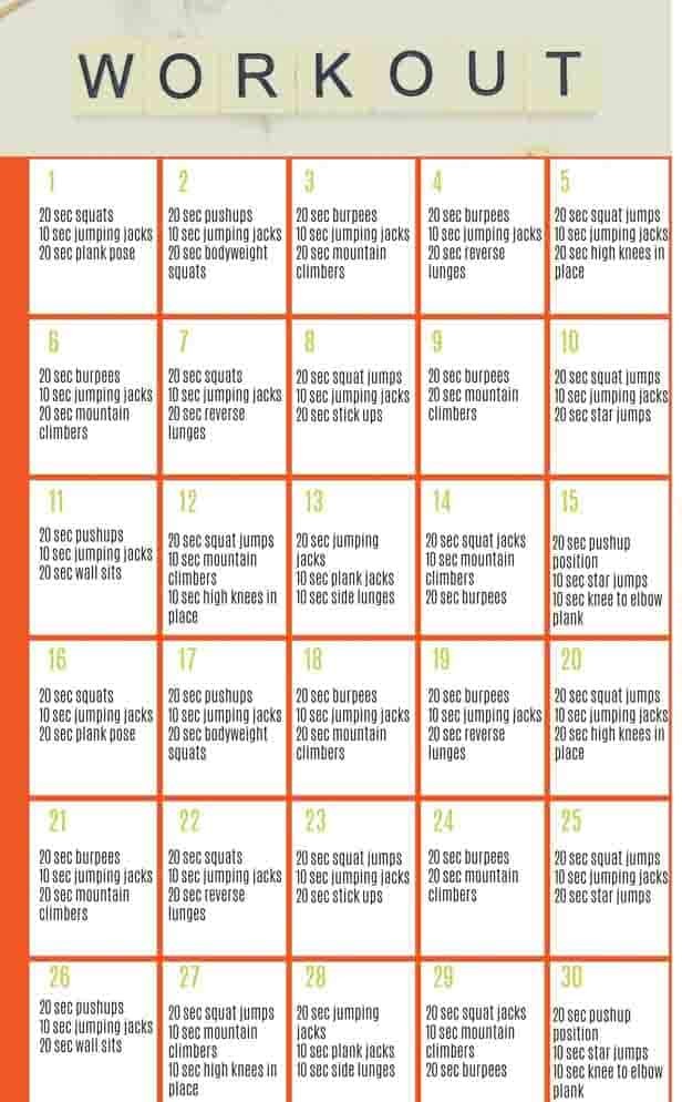 I was just thinking of a challenge we did many years ago, Tabata⌠It proposes 8 rounds, 20 sec work, 10 sec rest. I remember this was hard but easily adaptable. Idk.