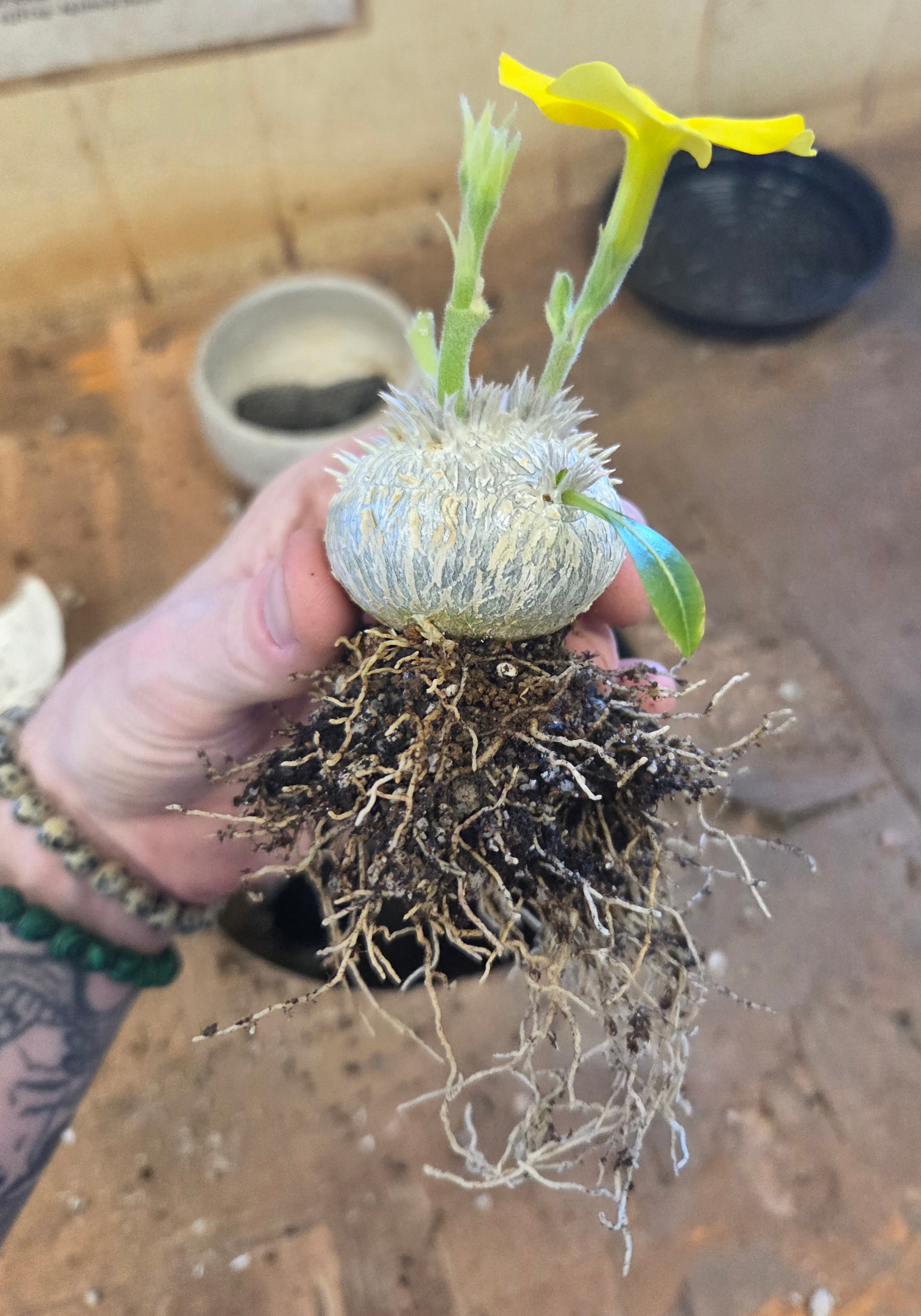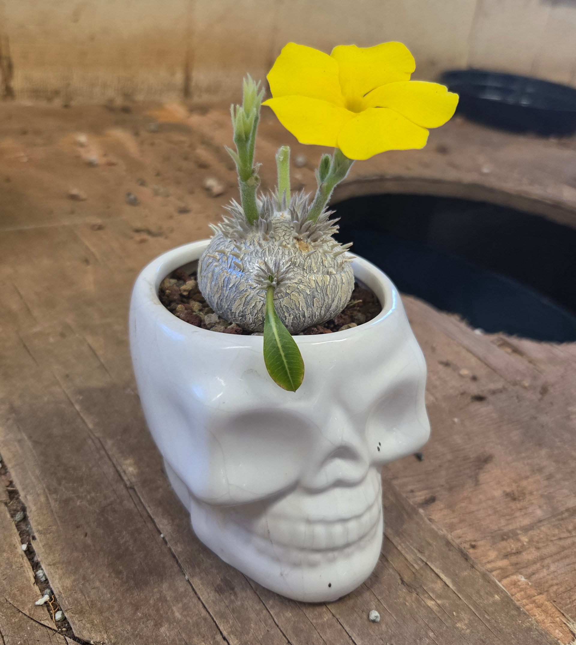 Also repot day for pachypodium brevicaule now that growth is beginning for the season. Ideally this is its “forever pot”. It grew much faster than they’re supposed to. Had to smash the skull pot to get it out unfortunately, wasn’t budging… but it was only $2 so no major loss.