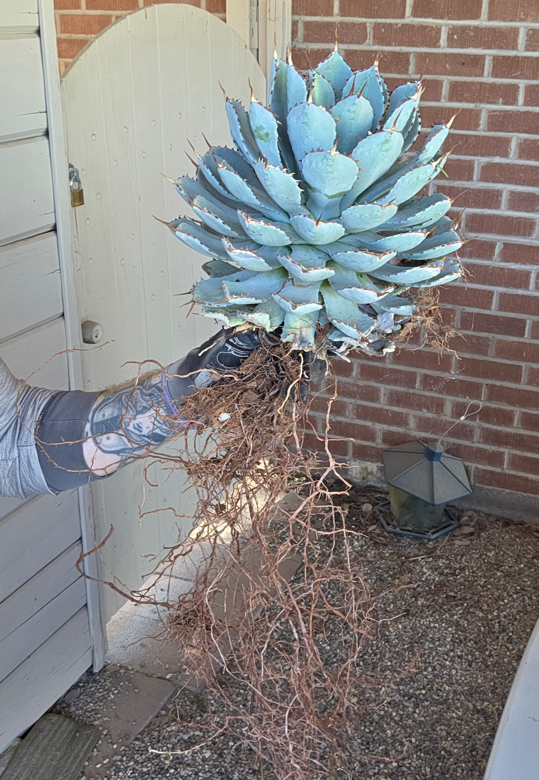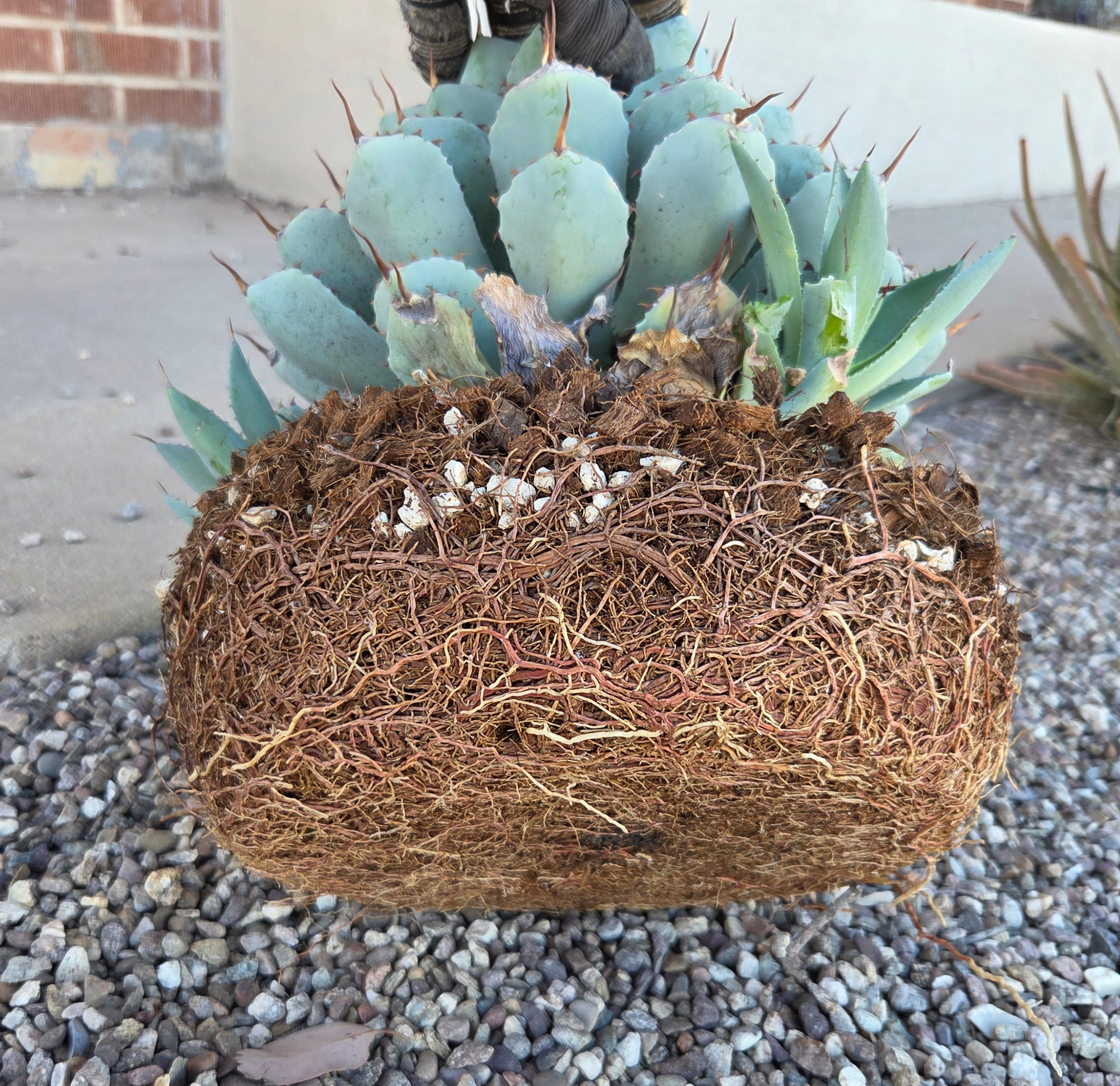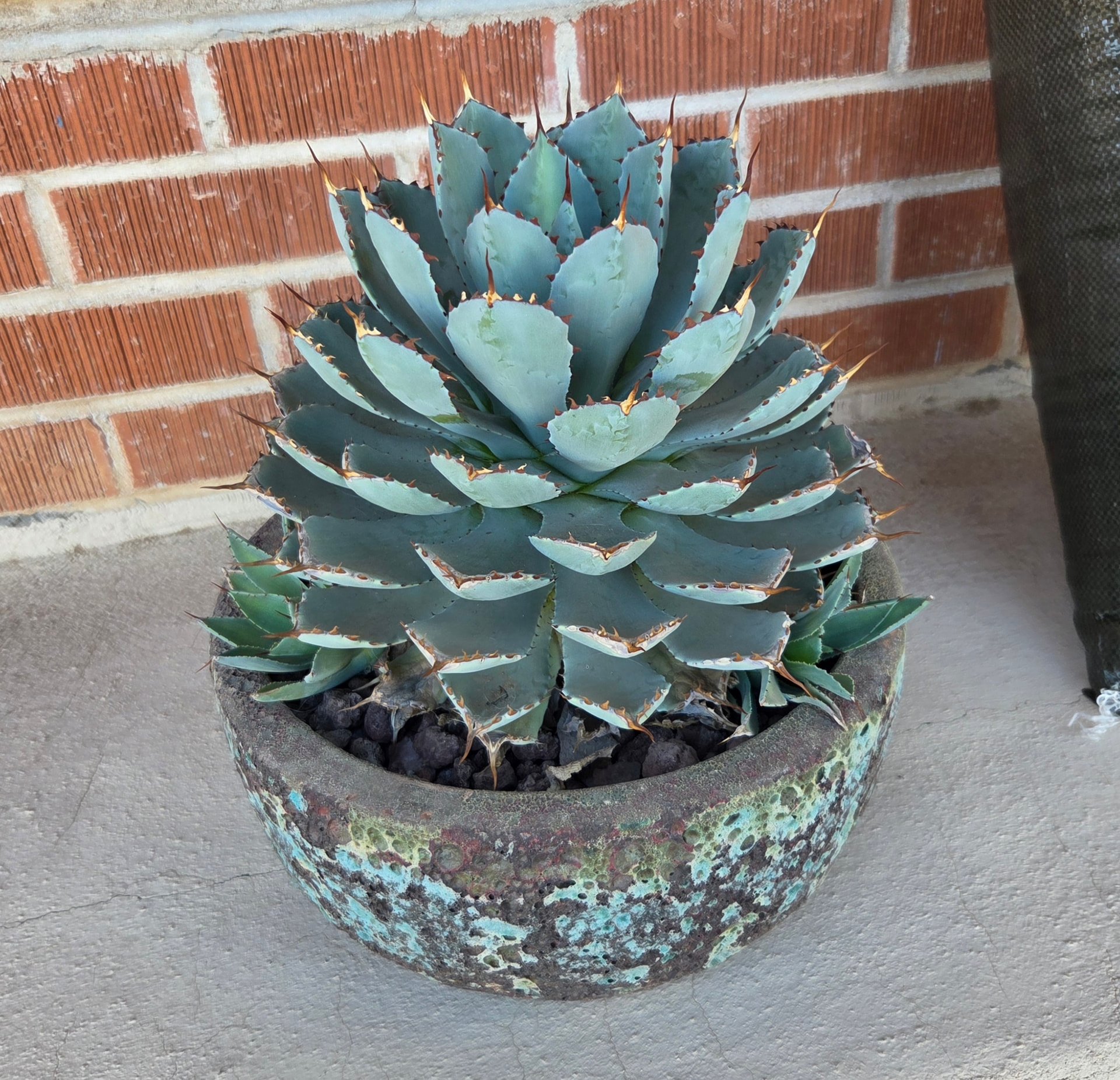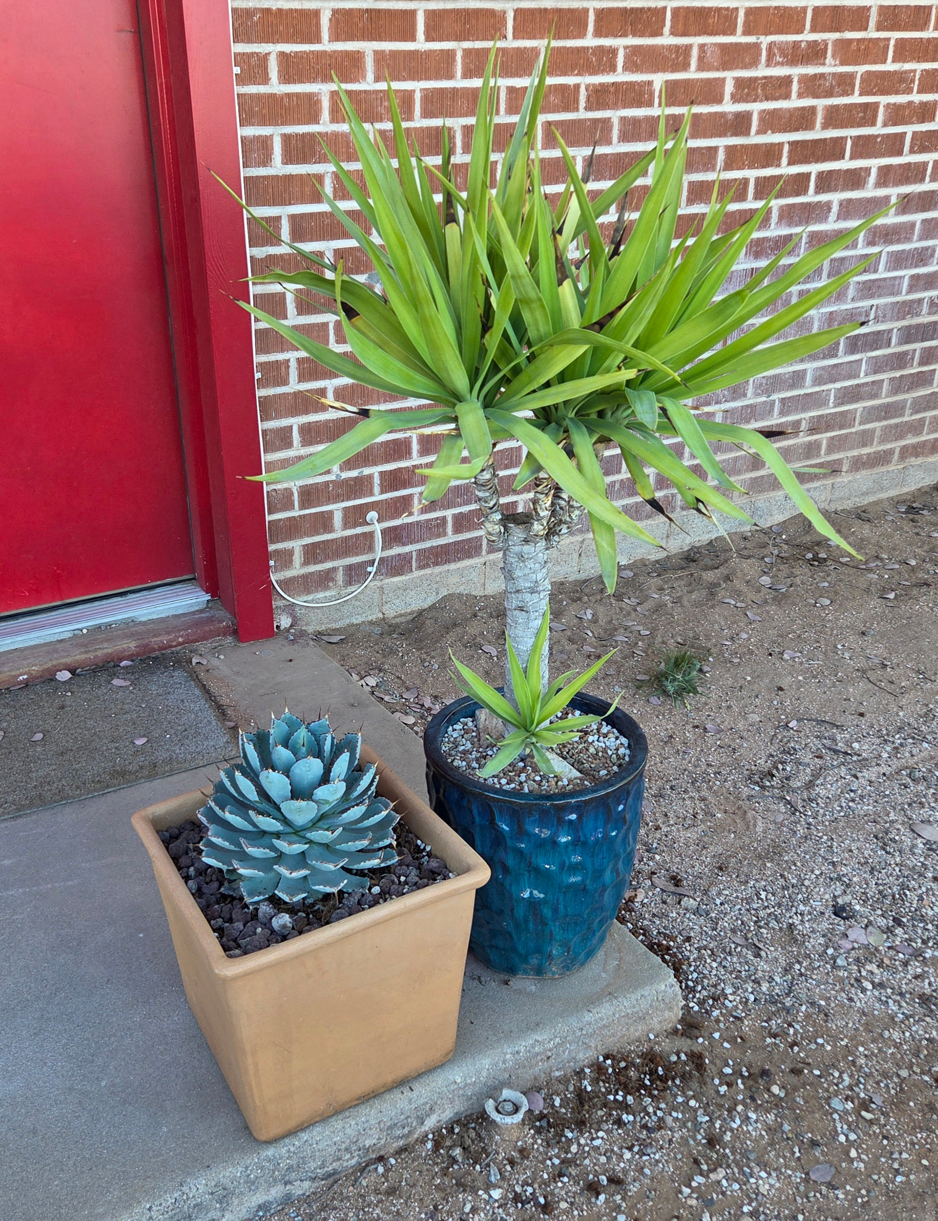 Finally migrated my agave potatorum from the greenhouse to the front stoop, and repotted into something larger. Had to do it soon so it can acclimate before the sun gets too strong. After a year alone on the stoop, my yucca that lives outside now has her old buddy from the greenhouse. Coincidentally I bought them around the same time, late 2021. Together again. Everyone needs a friend!