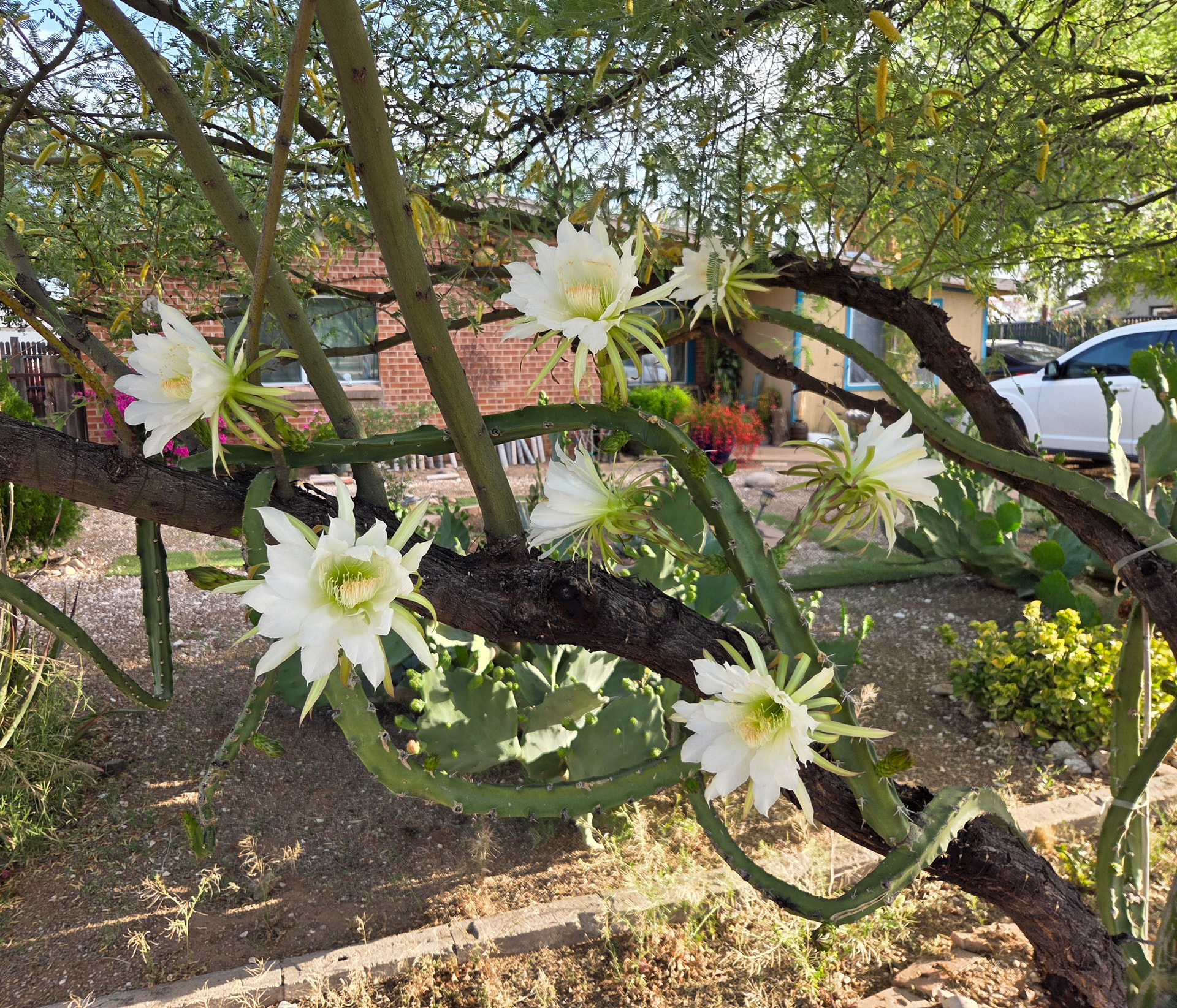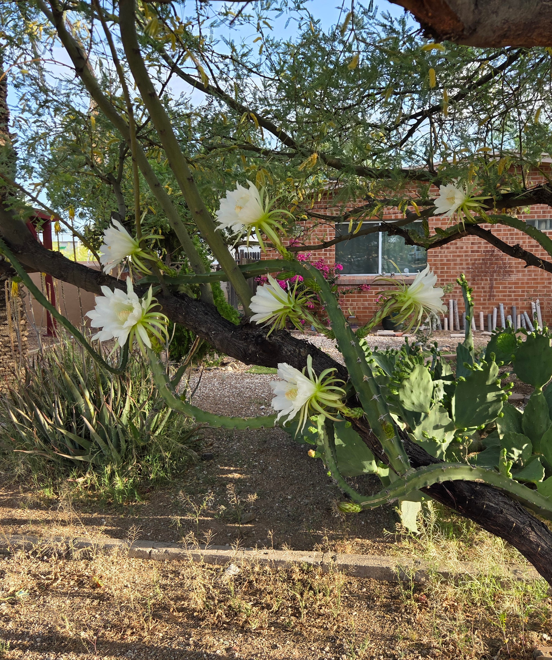 A neighbor down the street has this cactus in their yard (fairly certain its a type of cereus) which has snaked itself around their mesquite tree. Been meaning to get a pic for a while now, especially when it flowers.