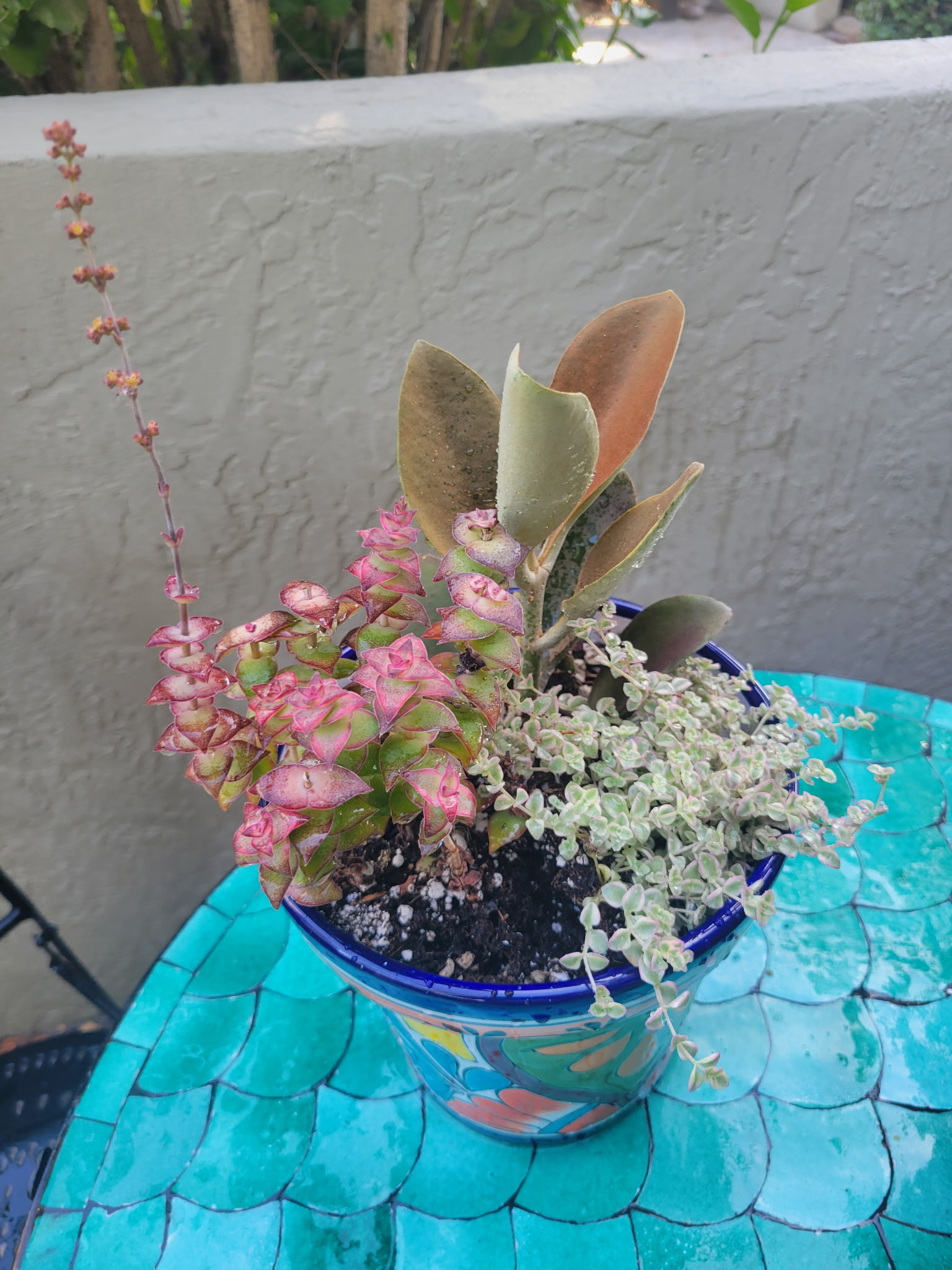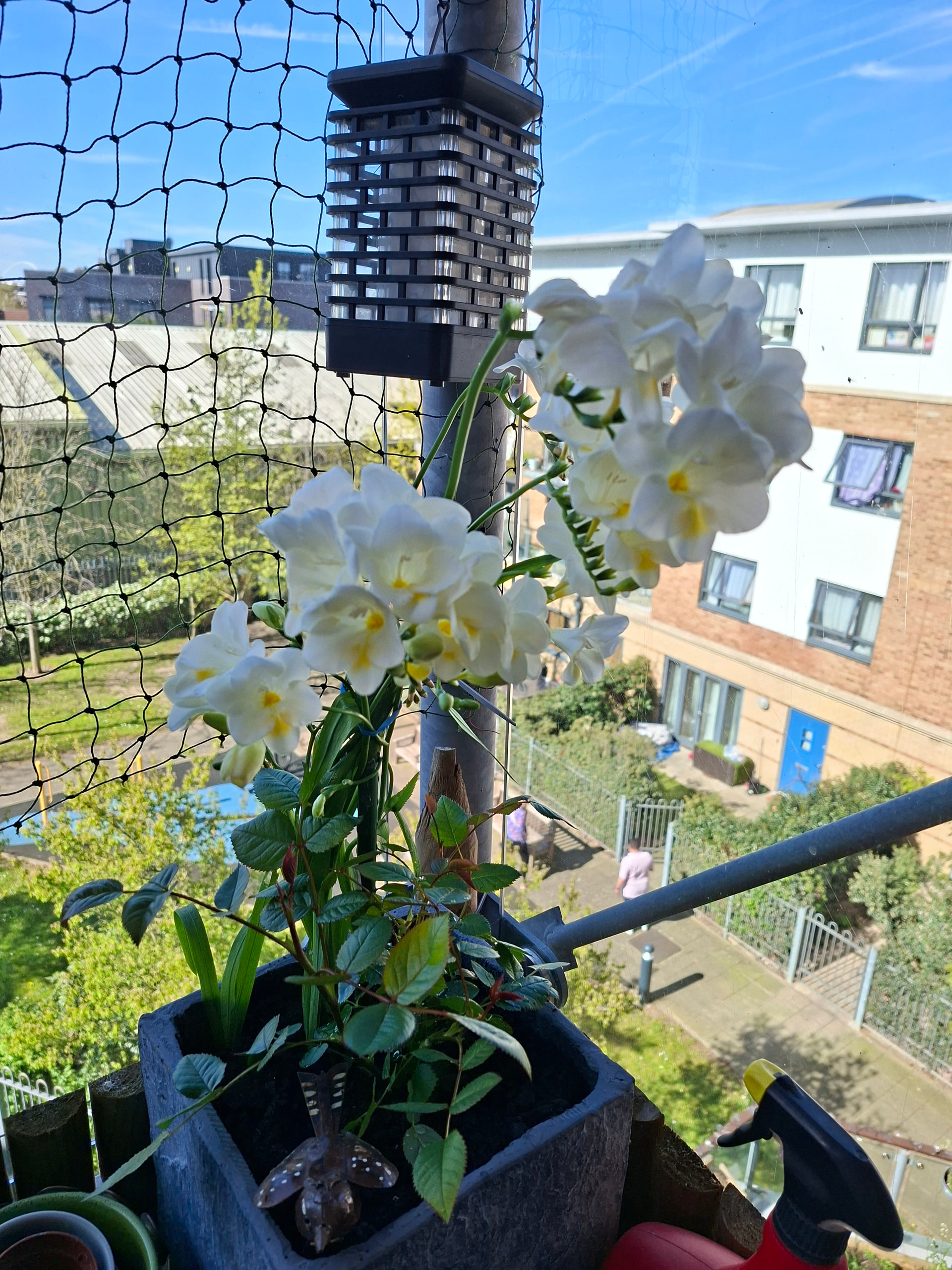 My gorgeous freesia that flowers biannually. In front of it is a miniature rose, yet to bloom this year. Blue does like to eat both of these sometimes…