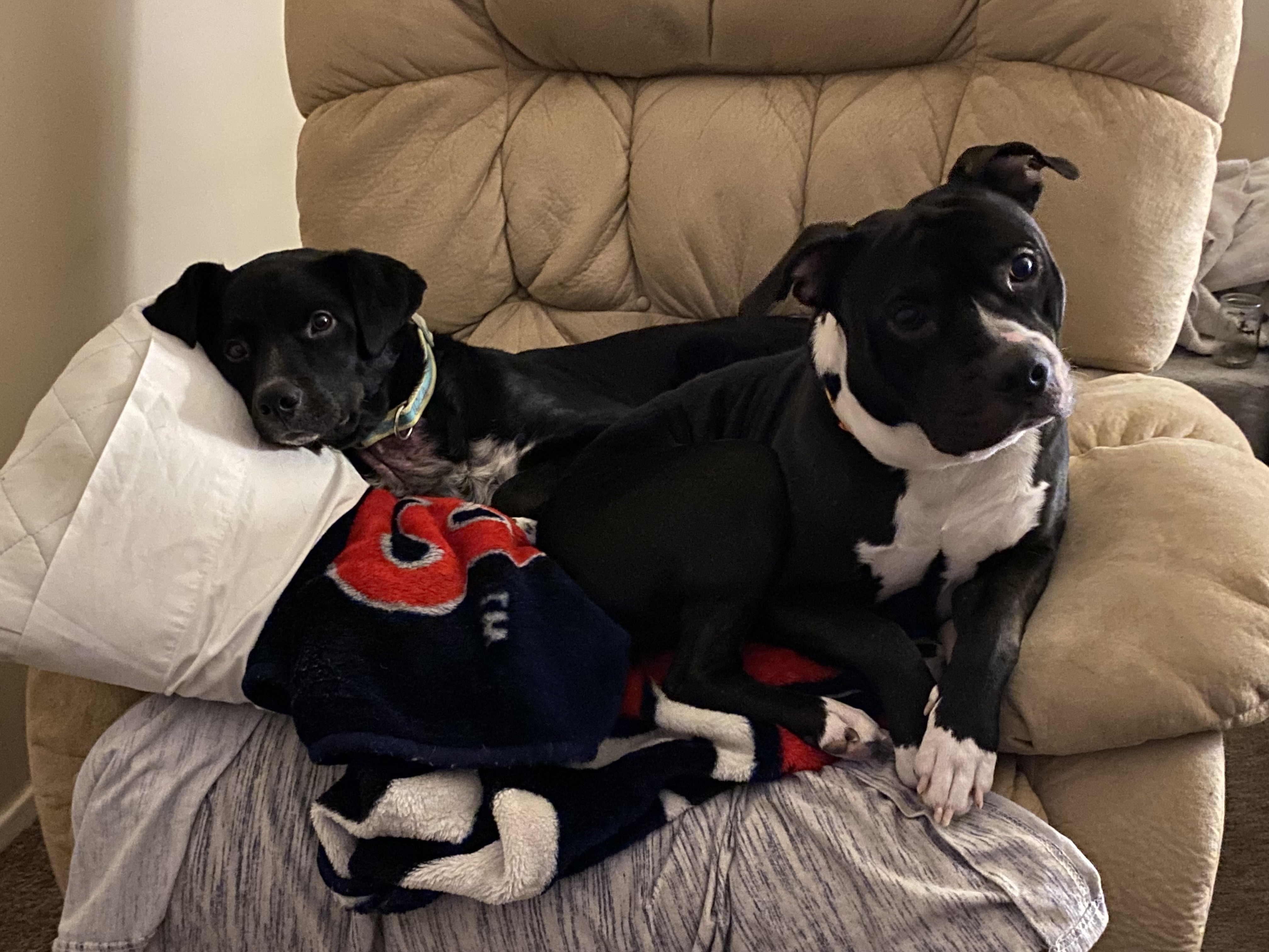 This is Reagan (L) and Biesel (R) they are the best boys. We call Reagan sir Escobar in the snow lol he loooooooves it. Biesel is my pittie/staffie that is scared of shiny things and sewers (soooooo vicious) His name was Diesel but I refuse to add to his stereotype and we was so goofy it just stuck lol