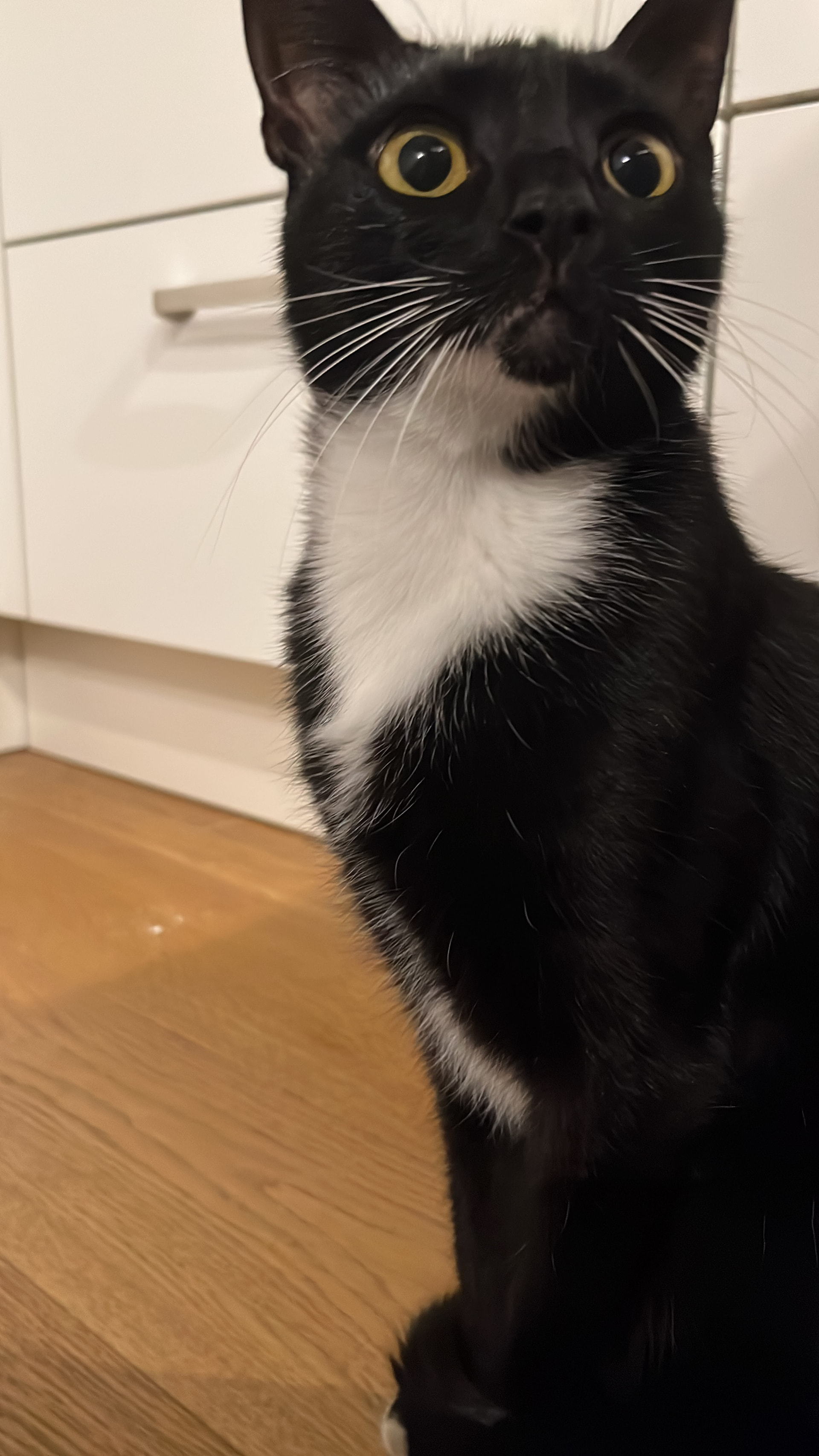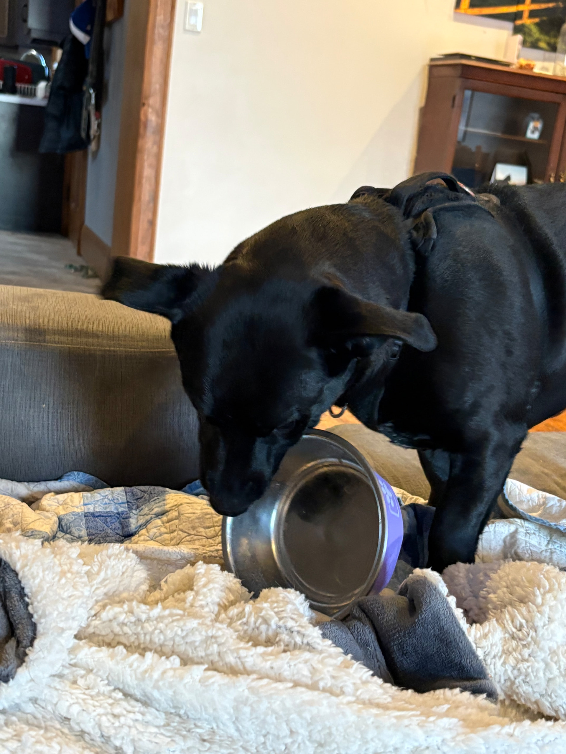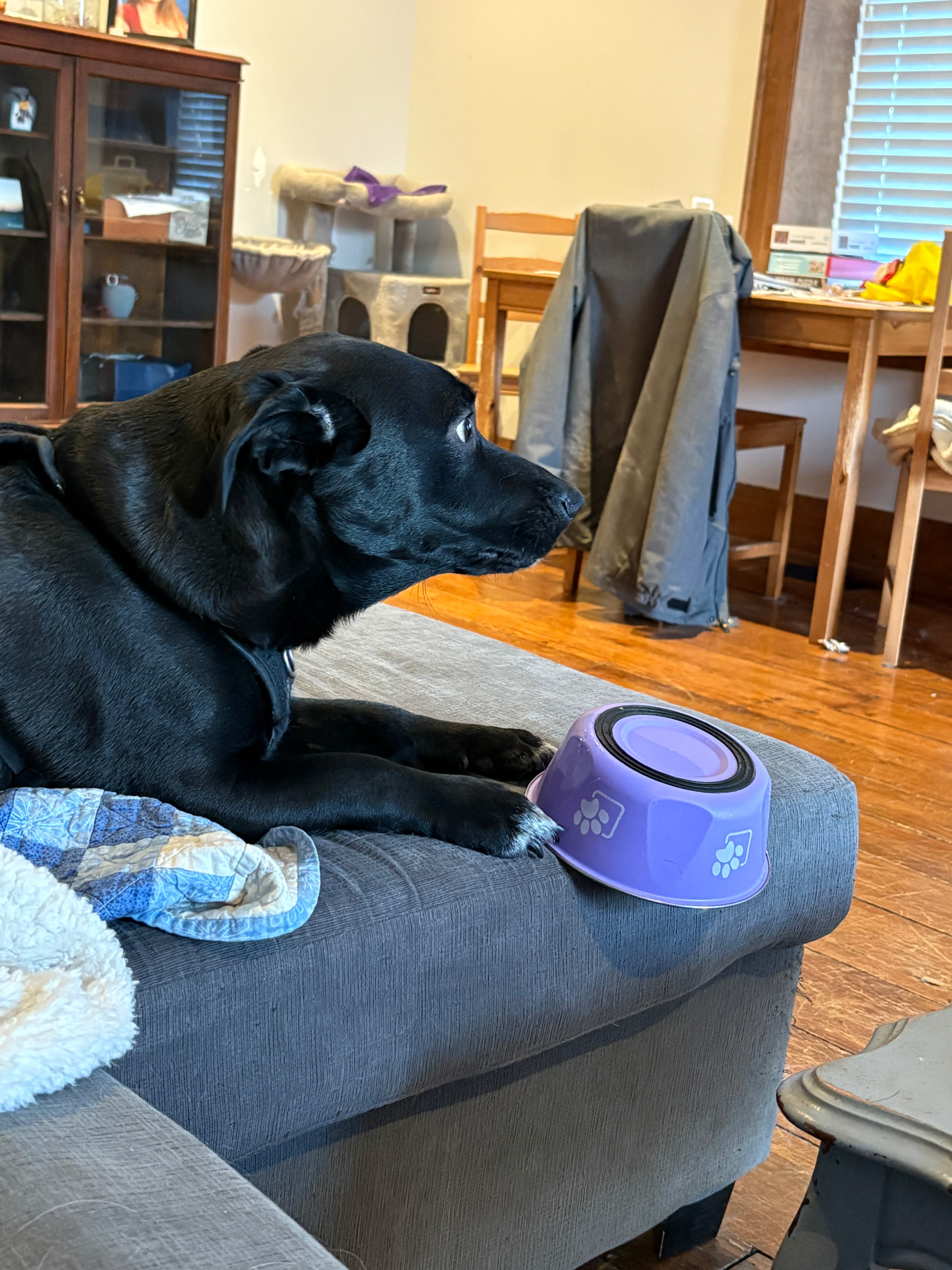 After eating all his breakfast this morning Stubbs brought his bowl to the family room hoping to score a second breakfast.