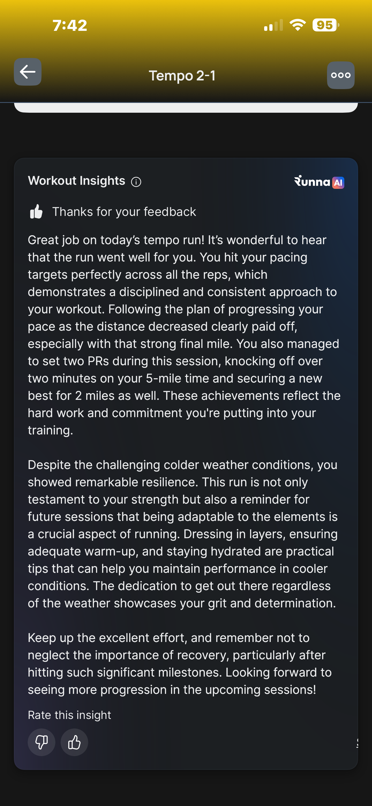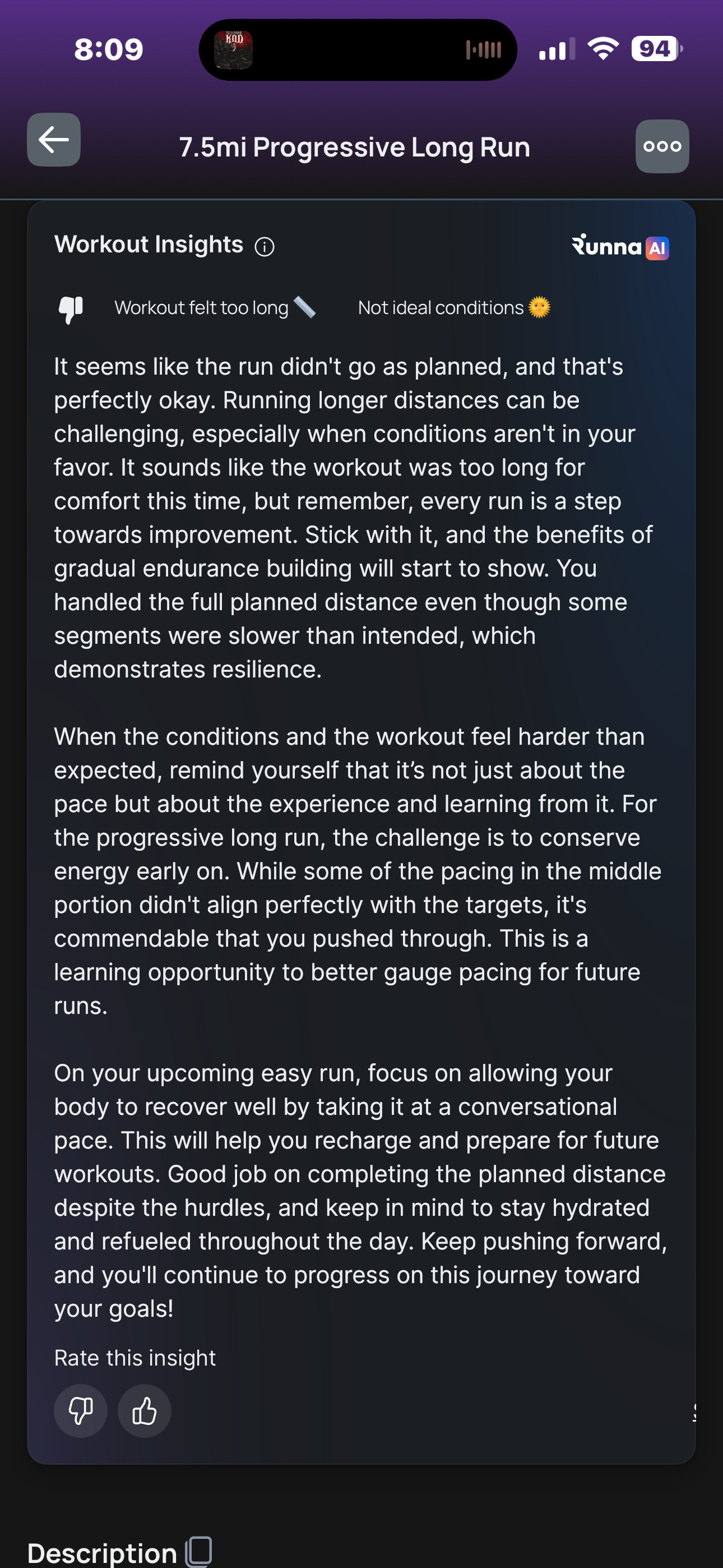 I did this while bleeding out. I like how the Runna AI took my feedback for its comments lol