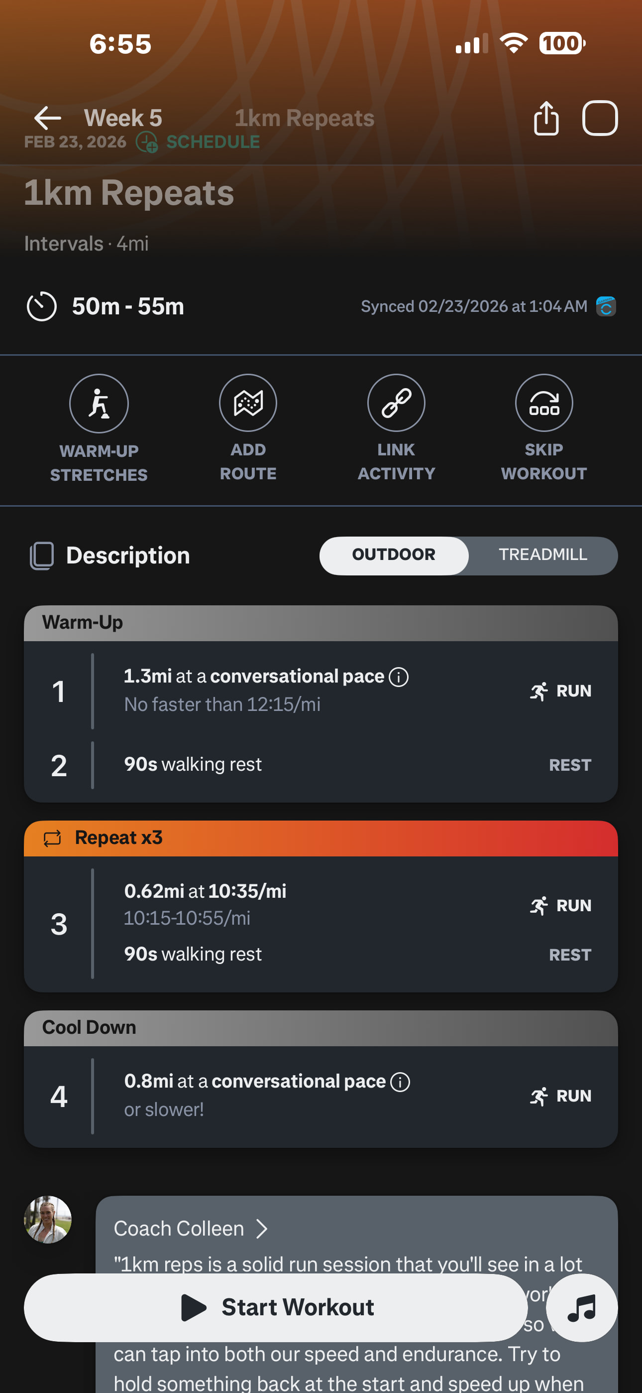 Intervals today. I am trying to trust the program as I enter into week 5. I have a hard time believing I can do 10 miles at 10:55 a mile. Just doing the little intervals today was hard. My biggest problem is breathing