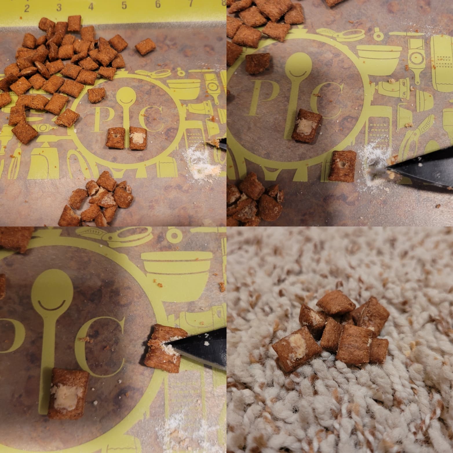 Making her majesty’s medicine pockets involves using one of my throwing knives to dig a little hole in the treat (Temptations), dip some of the filling into the two crushed pills, and stuffing it into the treat. I use the split treats to take the stuffing out.